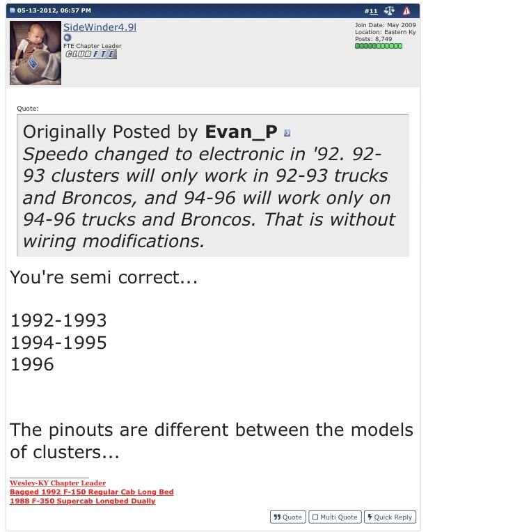 I had one major problem that still is not sloved. With my new cluster the alternator was not charing and it would slowly drain the battery so that it would not run anymore. I finally switched back and everything charges just fine. I can only figure that the dummy batterly light, amp light??, is using a differnet pinout than on my original dash. I still need to trace the printed circut board on the back to see if I can just switch a couple wires or if the dash will not work in my truck.