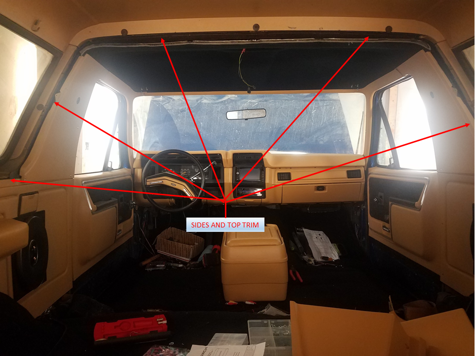 Hi Guys, I have a question about the trim around the top. My 86 Bronco was apart when I bought it, so I'm thinking I'm missing some trim. Does anyone have, or can get pictures of the side, where it goes up and across the top? I hope this doesn't bite me on the backside with this restoration because I can't find anything on the internet about it and it looks awful without it. Question 2, would anyone know where to get any of this trim?