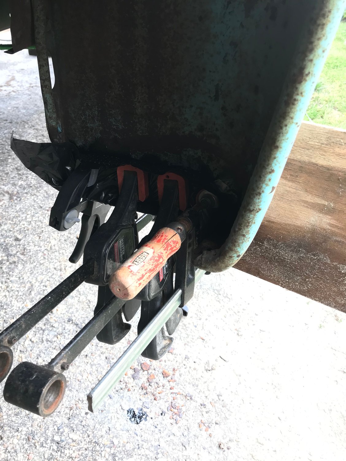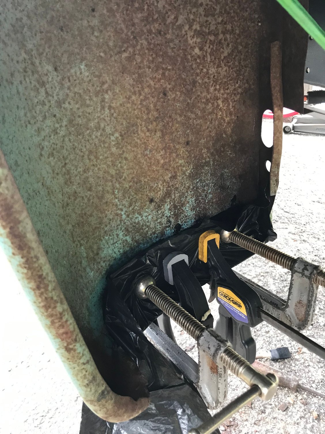 I clamped it all in place first covering the repair in plastic and then pressing the backing plate metal in tightly to the fender and compressing the fiberglass and mesh together. The POR patch acts as a glue somewhat like panel adhesive and reinforces the area and secures everything together.