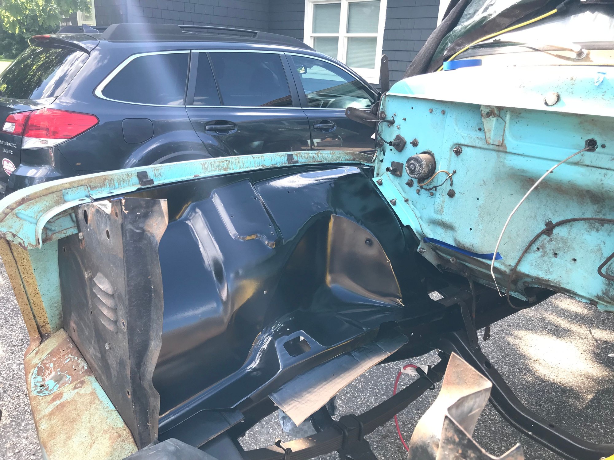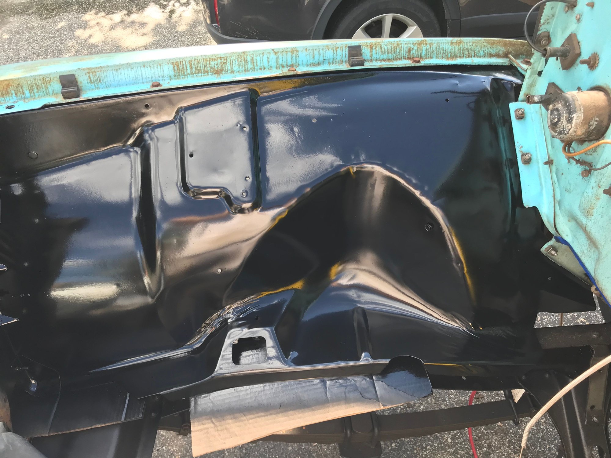 Below is a picture of the drivers side inner fender which represents the “before” and the passenger one stripped with a wire wheel and painted with POR Chassis black spray paint.