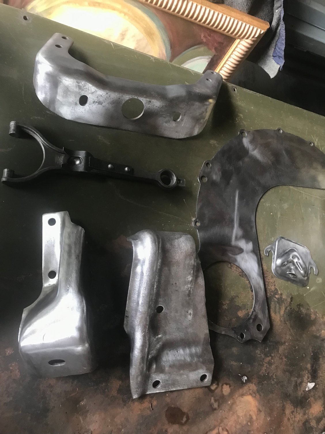Only had a couple of hours to work on the truck yesterday. Got a bunch of parts cleaned up with the wire wheel and ready to paint. Motor mounts, oil bath, flywheel cover, inspection cover, etc.