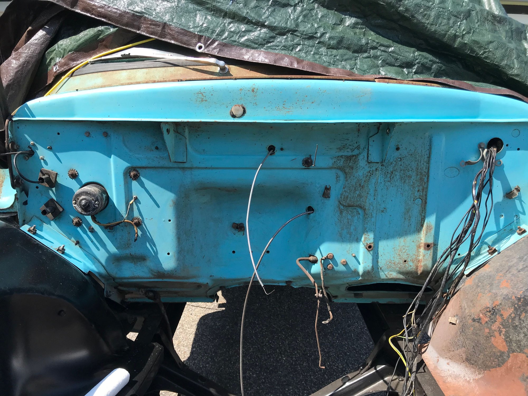 I did what I call a Stage 1 cleaning of my firewall. I wiped it down with mineral spirits to get the heavy dirt and grease off as well as the seam sealer everywhere. I cleaned the Speedo cable to get all the old oil and black tar off of it and it is pretty nice now.