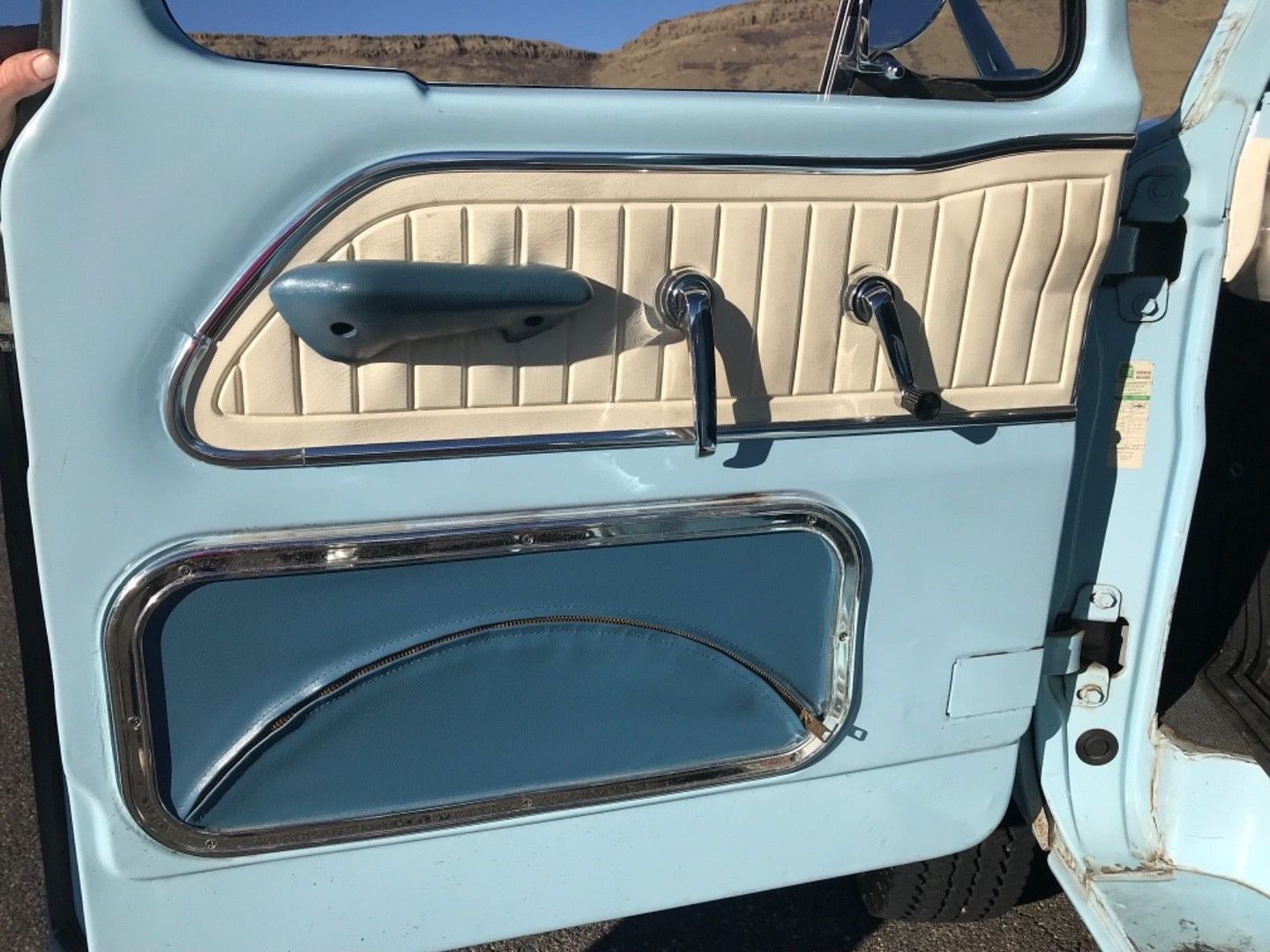 Mearntain, I'm not sure what you mean by correct. It looks like 1964 Skylight Blue to me, but is it indeed original paint on the outside? Who knows. Does it matter? If you want to keep the patina then it does to you, I'm sure. How do you tell? If you can't but you know of a good body shop take it there and have them take a good look at it and see if they can decide if it is original or not. Usually there are signs like a bit of overspray onto some rubber or trim parts or tape lines in the door jamb area. If not, it could be original paint. I will say again, and not trying to be rude, but that picture you show of your truck the paint is oxidized pretty badly. I'd call it "chalky" looking. It happens a lot to the older paints when they are subjected to years of outdoor living. But, if it matches the interior and if the interior for sure has not been painted (again, without really good pictures of certain spots of the interior it can be hard to tell from a computer screen) then it has to be correct, doesn't it?