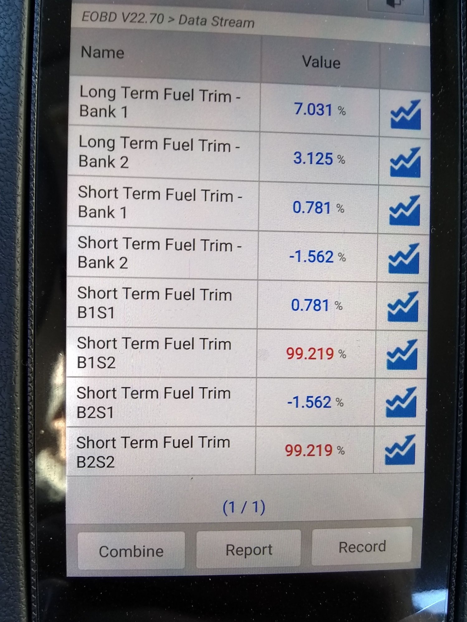 Short term Fuel trim - Technically anything in the range of -25% to +25% is considered normal, but realistically, less than 5% is what you want to see - don’t worry too much about the long term at this point. The LTFT is used by the PCM to adjust over time - not that it can never be useful, but in terms of diagnosis, STFT is what you want to watch.