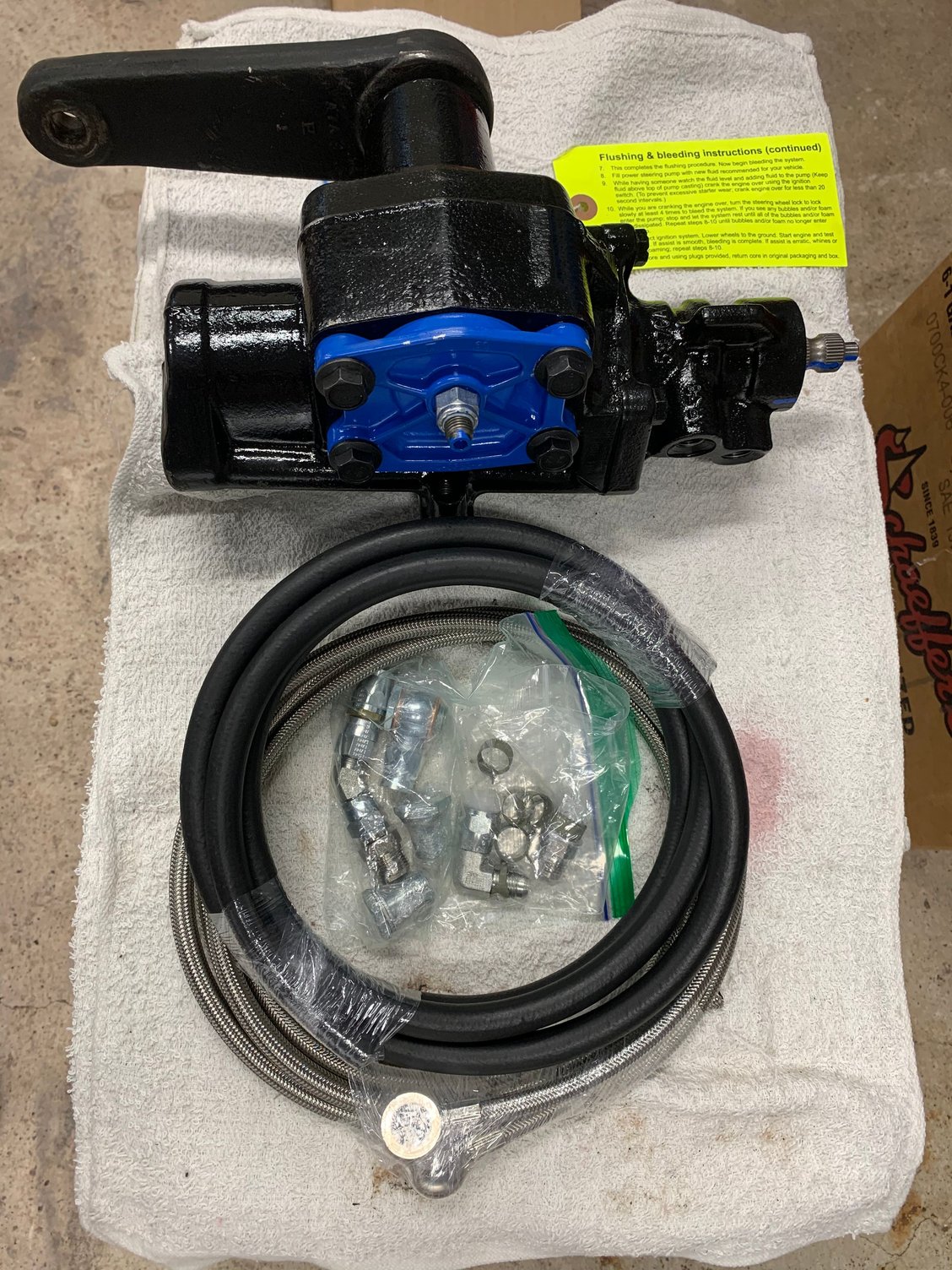 I scored a Mishimoto power steering fluid cooler for $50 off because the box was damaged. I’m completing the upgraded steering system with this and braided lines from the steering gear and return line to the reservoir. It’s 2x3x12” so it is actually larger than the stock cooler and looks nice.