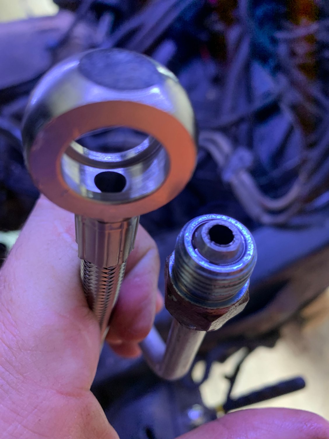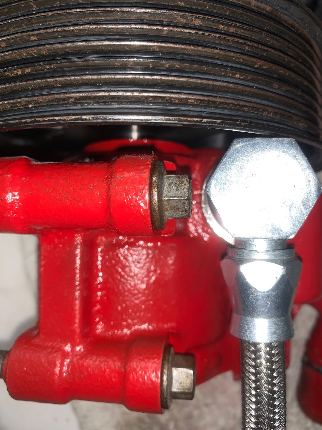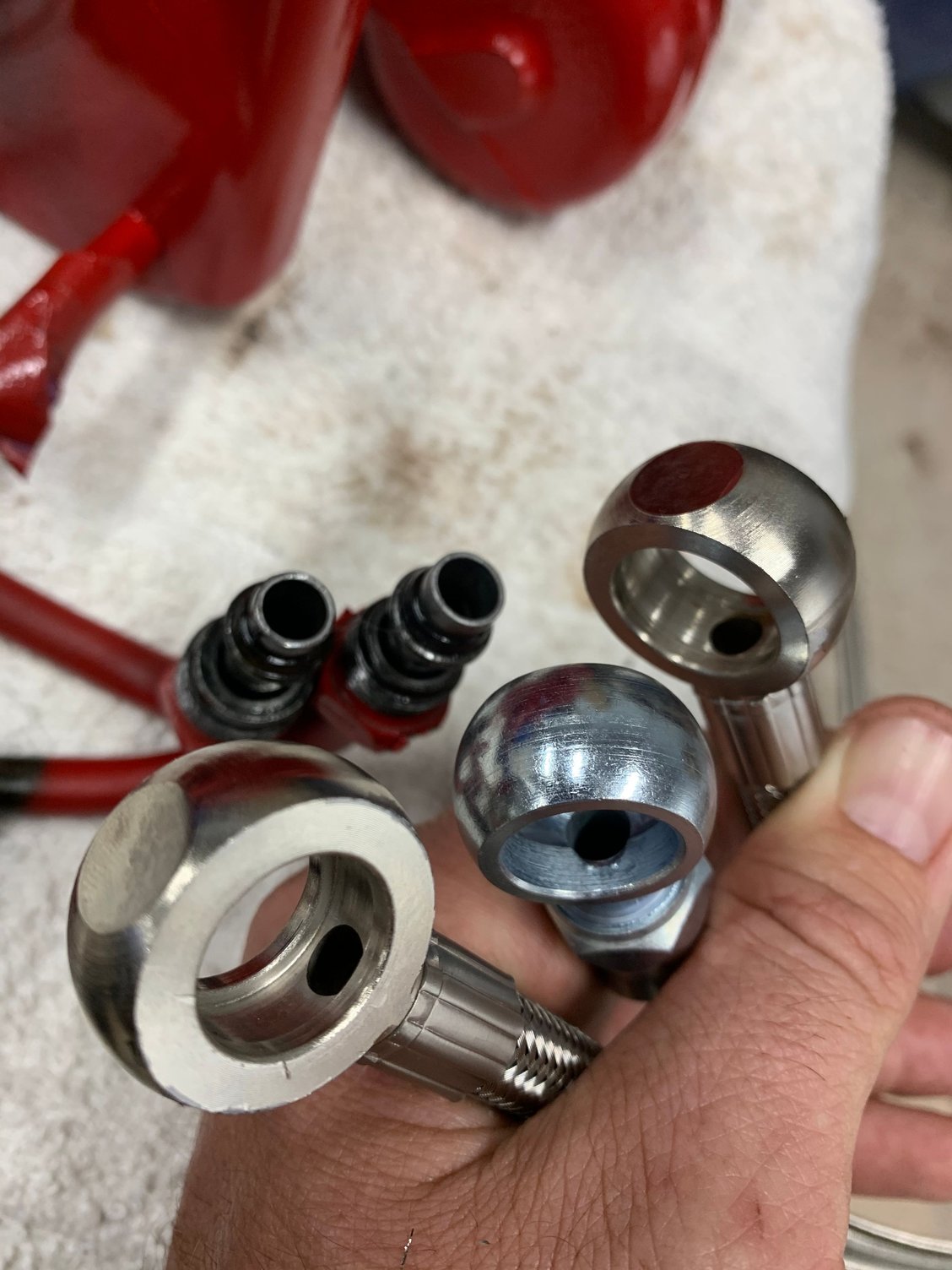 Power steering hose and fitting kit from Sweeting’s Banjo ends Looks the same size to me, Matt said he stands behind his product and if I don’t notice better steering and brakes I can send it back...we shall see. Had to get him to send the proper fitting for the power steering pump because this one had to be tightened up before the pulley was pressed on and almost hits with about 1/16” more to go to get the pulley completely pressed on...he’s sending an alternative fitting. I was not impressed and told him what I thought about this product. Rebuilt hydroboost and cleaned up master cylinder in.