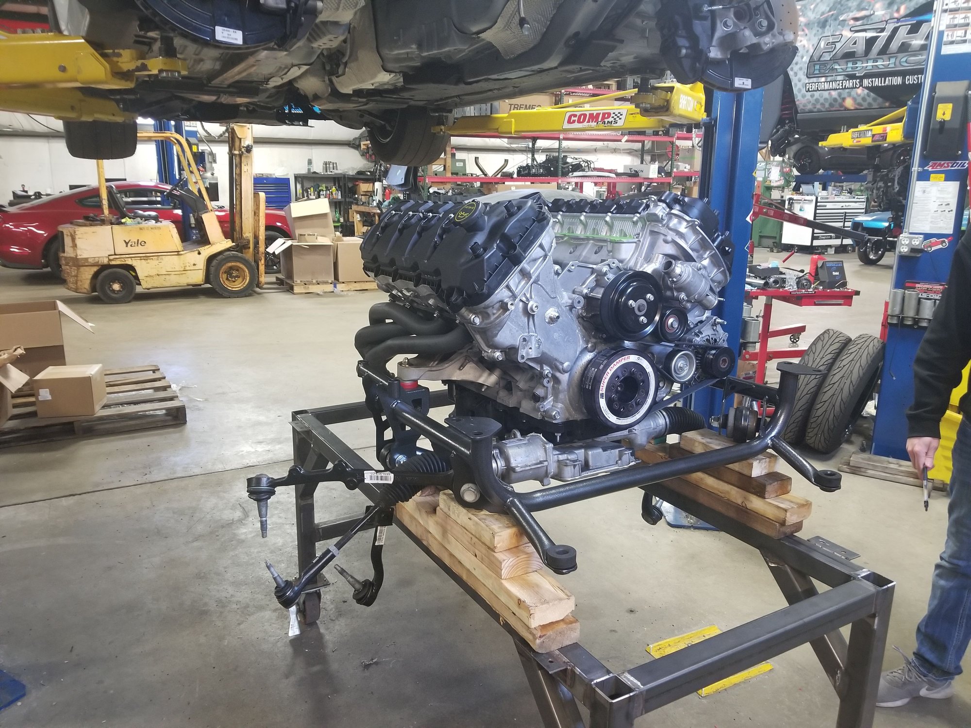 We can do that! You will have to make sure I don't try and swap you trucks while I'm out there though! Its finally going back together as we speak. Just got the short block and heads back together and sat on the new tubular K-member. The next few days it will get the engine dressed up and the trans reinstalled and put back into the car. It will hopefully be moved down to fab mid next week. Jeremy has to fab up the drag setup intercooler pipes and intercooler. He will also be working on fabing the required brackets to make this K-member work with the GT350 ride height sensors and what not. Once it gets done at fab we will have a few more things to finish up like mounting the new shiftier setup and interior stuff and finally assembly items. Then it will be ready to go run some 7s!!!