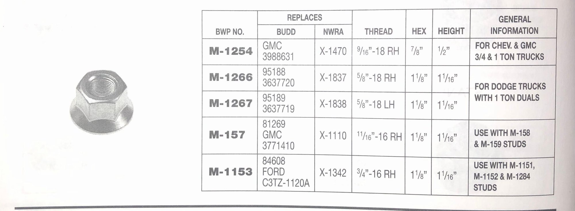 I’d like to take another shot at this to hopefully save davidg from twisting off wheel lugs on the left side of his truck. Plus hopefully he reports back what he finds on the truck to settle whether the Ford reference is right, or the numerous other industry references. Bill (ND) will agree I’m sure that the Chassis Catalog shows both right and left hand threaded fasteners used on the 63/64 F/B/N-600 trucks. But every period industry reference I have, as well as current on-line references I checked, show only right hand threads used on hub piloted mountings. The below shows the NWRA code for these original lug nuts to be X-1342 which crosses to Ford C3TZ 1120-A. This is a right hand threaded nut, with no left hand equal cited.