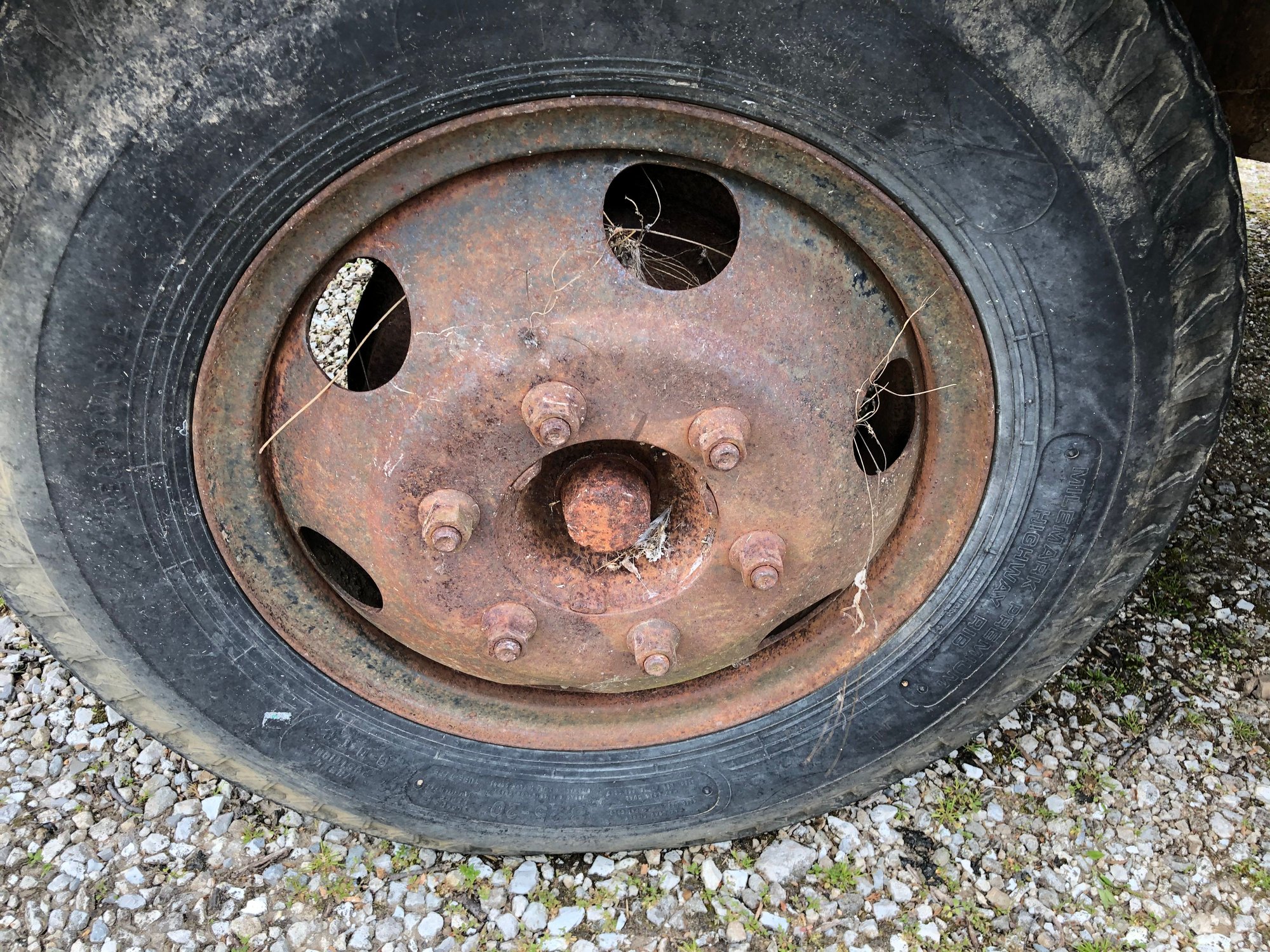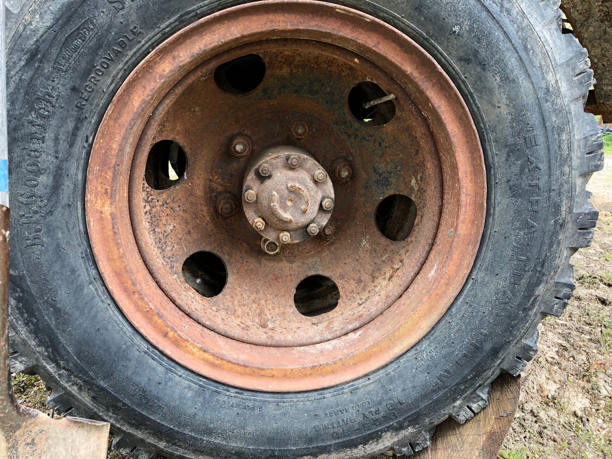 Hub piloted widow maker Firestone RH-5°s. I’m gonna go into this and probably belabor every point assuming it’s new information to you. Below are pictures of the RH-5° showing how it goes together - and can violently come apart. Do not attempt to mess with them yourself unless it is to pull the valve stems releasing the air. Be especially careful around the outer duals.