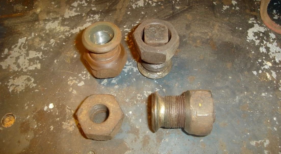 When davidg swaps out his widow makers for safer stud piloted wheels these original lug nuts won’t work on the replacement wheels. Either all new Budd style nuts, or saved right hand threaded used ones from the donor truck, will be needed. The original wheel lugs on the truck can be left in place and used with the new stud piloted fasteners. Additional right hand threaded nuts will be needed for the other side of the truck.