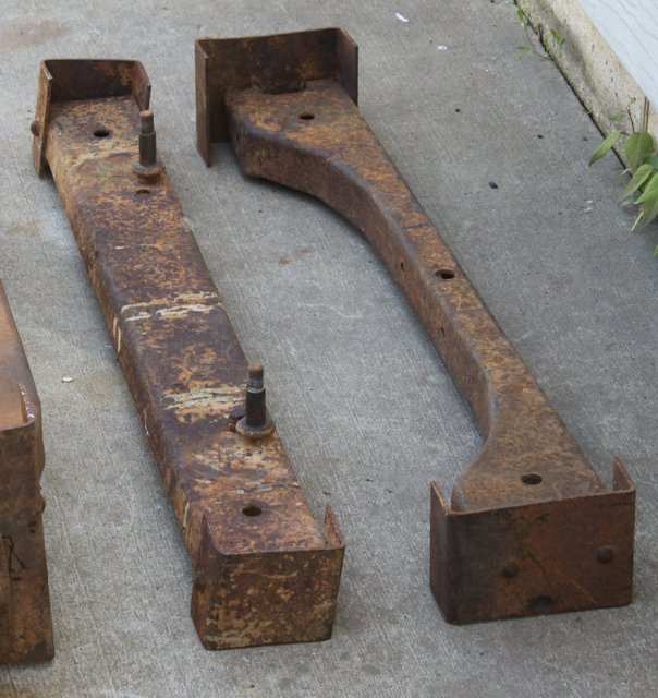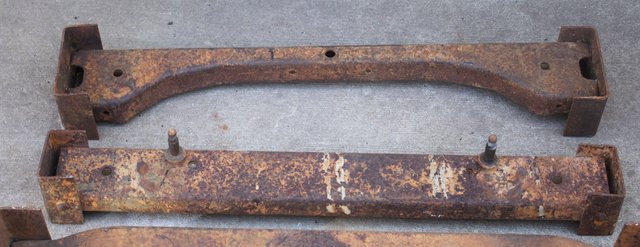 I have a frame crossmember off a 1954 F100 frame. I believe this crossmember in located under the rear of the cab. This is the crossmember with the curved bottom. I've had a few of these that were notched/cut out for driveshaft clearance, on some trucks with engine swaps. This one is in good shape. It is very solid, no rust thru or thin spots, just surface rust. It has small chunks of the frame rails still rivoted on. If you want, I can remove them. Or if you want them the way they are pictured that is fine too. But it will be cheaper to ship with them removed.