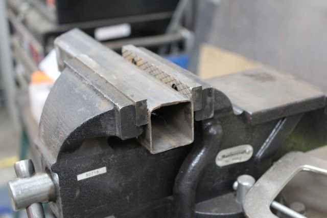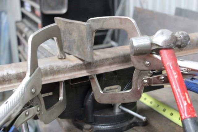 The back panel of the cab at the bottom between the 2 outer cab corners has a lot of pin holes so I formed a piece of 18 gauge that will replace the damage. I was trying to figure out how I was going to press the grooves to match the back. All I did was place a piece of 1 1/2" square tubing in the vise which was the widest point of the groove and a depth of 1/4" and use a piece of scrap steel and a hammer to simulate the groove and some hammer and dolly work.