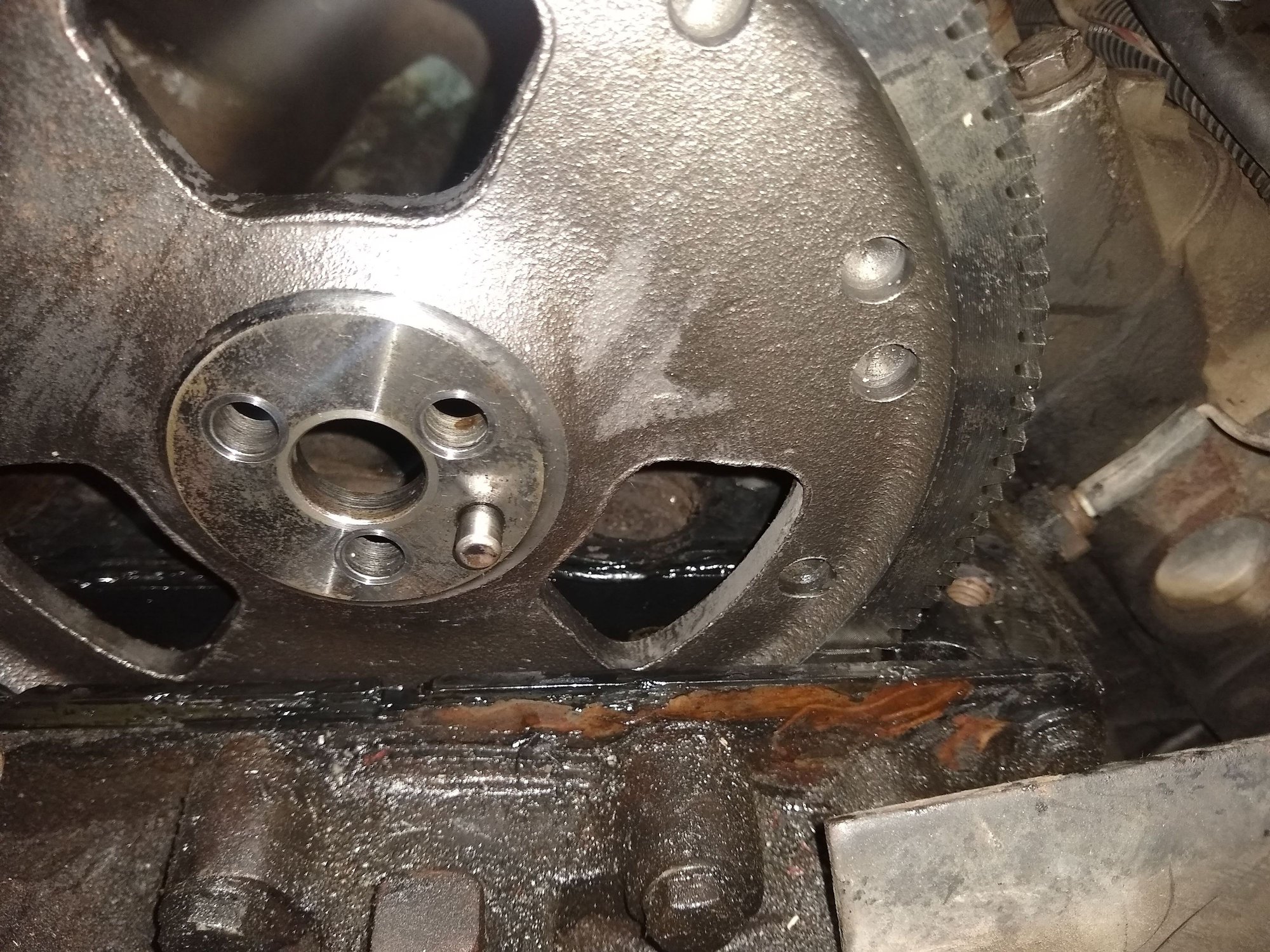 So I got some time today to pull the pump. Once I got the cover off the gear. I took a carbide scribe to mark where I was. You can see in the right bottom of the gear. So I pulled the gear out, cleaned it up then counted up seventeen teeth on both sides and used a marker to use as reference for the install. The scribe I put on the gear was up at the 18th tooth, so if the info I had about 17 teeth is correct I was off a tooth. So looking to make sure I was lining up the gear correct, I wanted to check the cam gear for it's mark. My mirror was too thick to fit between the block, then I remembered that for some reason I saved some hard drive discs. So if you ever need a super thin mirror, take a old hard drive apart and use the disc. I have some pics that I took while in the process of taking it apart. Putting it back together tomorrow. I'll report on how it runs. just in case you didn't know how much of the gear is exposed. scribe mark lower right 17 teeth both ways from center. You can see the scribe mark clear on the right. Fancy new mirror. Put a zip tie or something on it so you don't drop it in the motor.