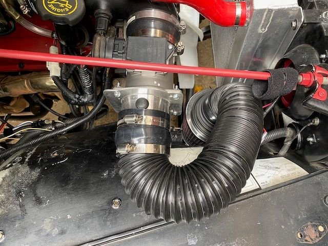 That is more of a hot air intake actually... open air filter in the engine bay, and depending what you are doing with the jeep having the air intake down low like that could be a good way to get water into the motor, but that won't matter at the moment. How far away from the throttlebody is the MAF?