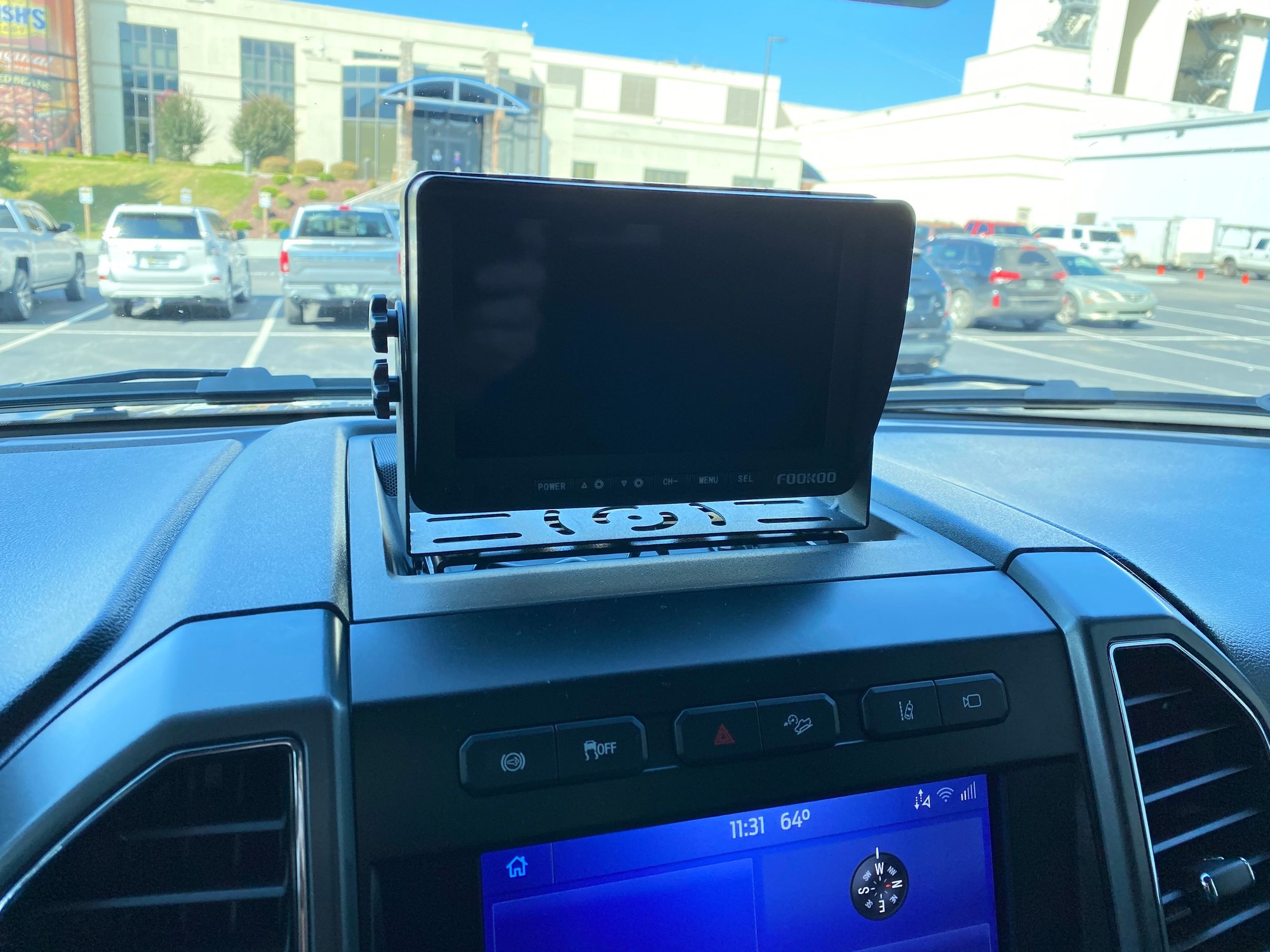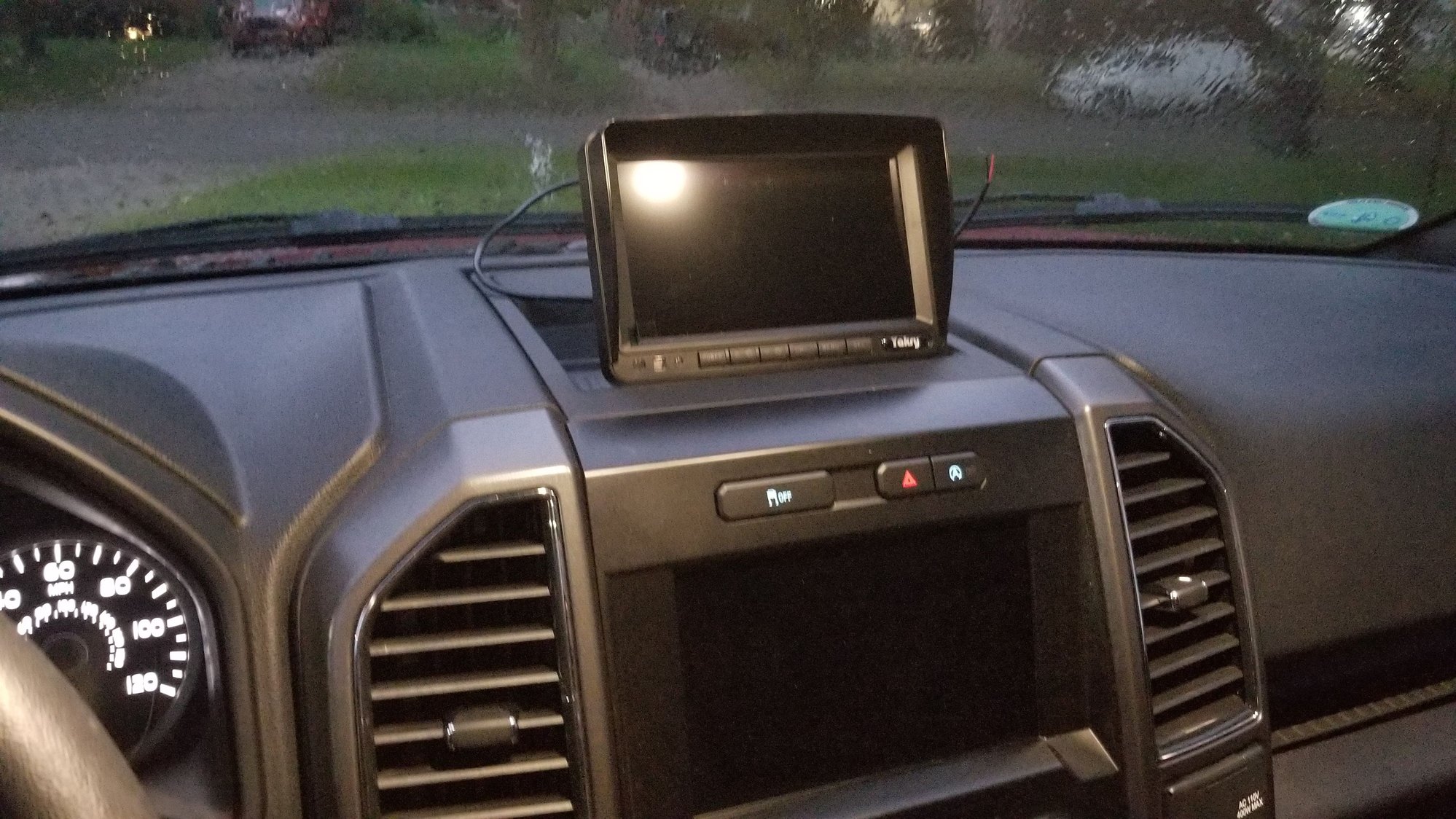 a Yakry YA27S HD 1080P Digital Wireless 4 Backup Camera for RVs/Trailers/Trucks. My Question is there is a Indentation that would be a good place to mount the Monitor portion of this system. Is it okay to mount this monitor up there with 4 1/2" screws? I would also be needing to drill a 3/8 hole for the power jack to fit through. I will remove the rubber pad up there and and make a slit in the rubber as to keep it less intrusive. (most likely will pick up a extra new rubber pad for replacement in case I sell the truck) The System comes with 4 Night Vision Cameras. I will be using this on two trailers so I most likely will be buying a couple extra cameras I also have ordered this F-350 XLT Truck with Upfitter Switches. Does anybody have a Pin Out and location of these wires? I would like to power on the screen with one of those. The Cameras on the Trailer will be powered on by t6he running lights. thanks