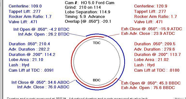 This is a plot taken from an actual non HO 5.0 camshaft. It has a 108 lobe sep and that is one of the reasons why these cores are so great to use for regrinding to make into a performance camshaft besides the overall high quality of the core.
