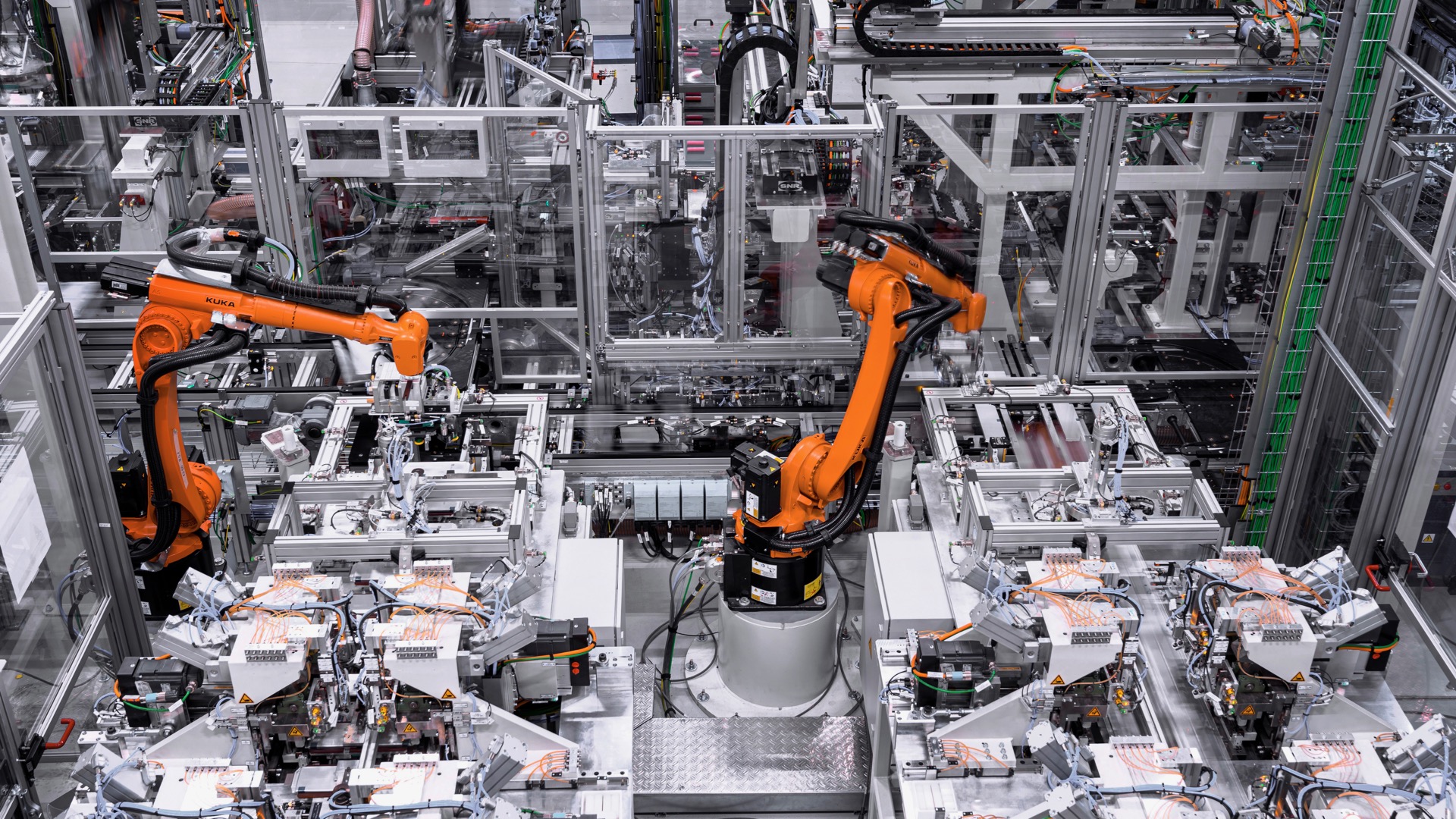 Mercedes-Benz battery production This is obviously a Wiring Semi conductor control station. No doubt Battery production is a trade secrete. The Robotics also appear vanilla missing parts in the work station. Oh well its a publicity picture not activity production. But, you can see how solidly the Robotics are fastened to their block, not just a poured slab but a very secure block.