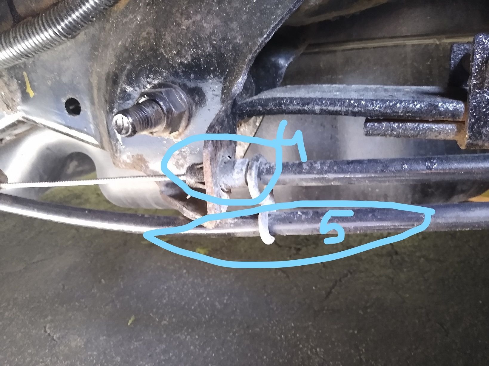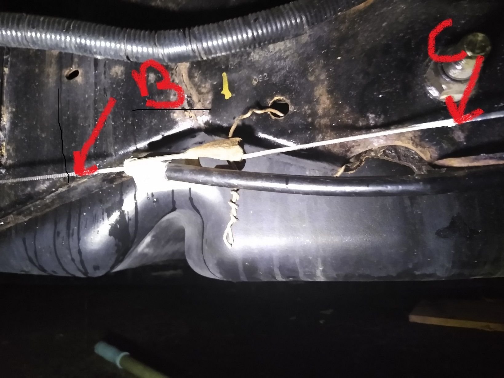 What do you know.. now brake lever could go much further down.. and cable from 5(above) and B here .. started coming out after pull on "C" stops because of coat hanger..... and I think now passenger side brake would engage.. It was raining so I could not much time out side.