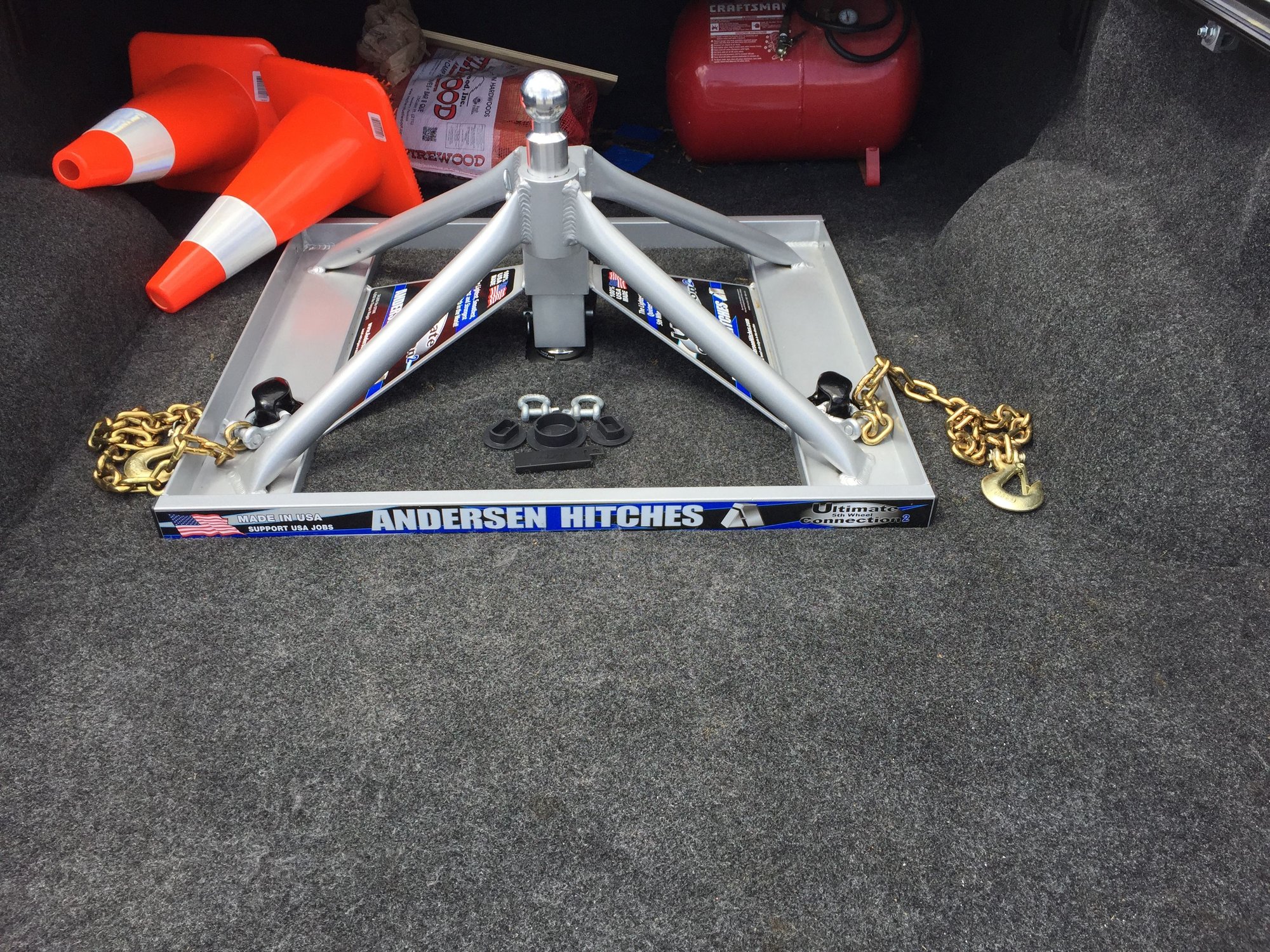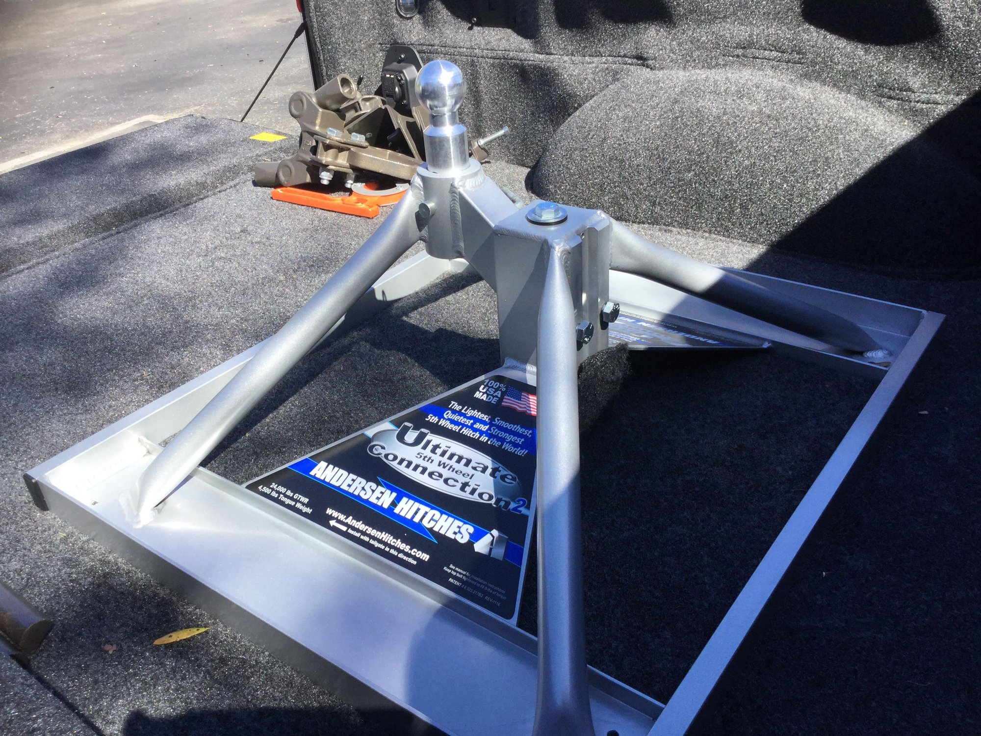 here is a few picture in my F350 with my Andersen 5th wheel hitch. When I pull the hitch out I just pop in the 3 squares I cut out to access the ball and 2 chain attachments and you can’t tell.