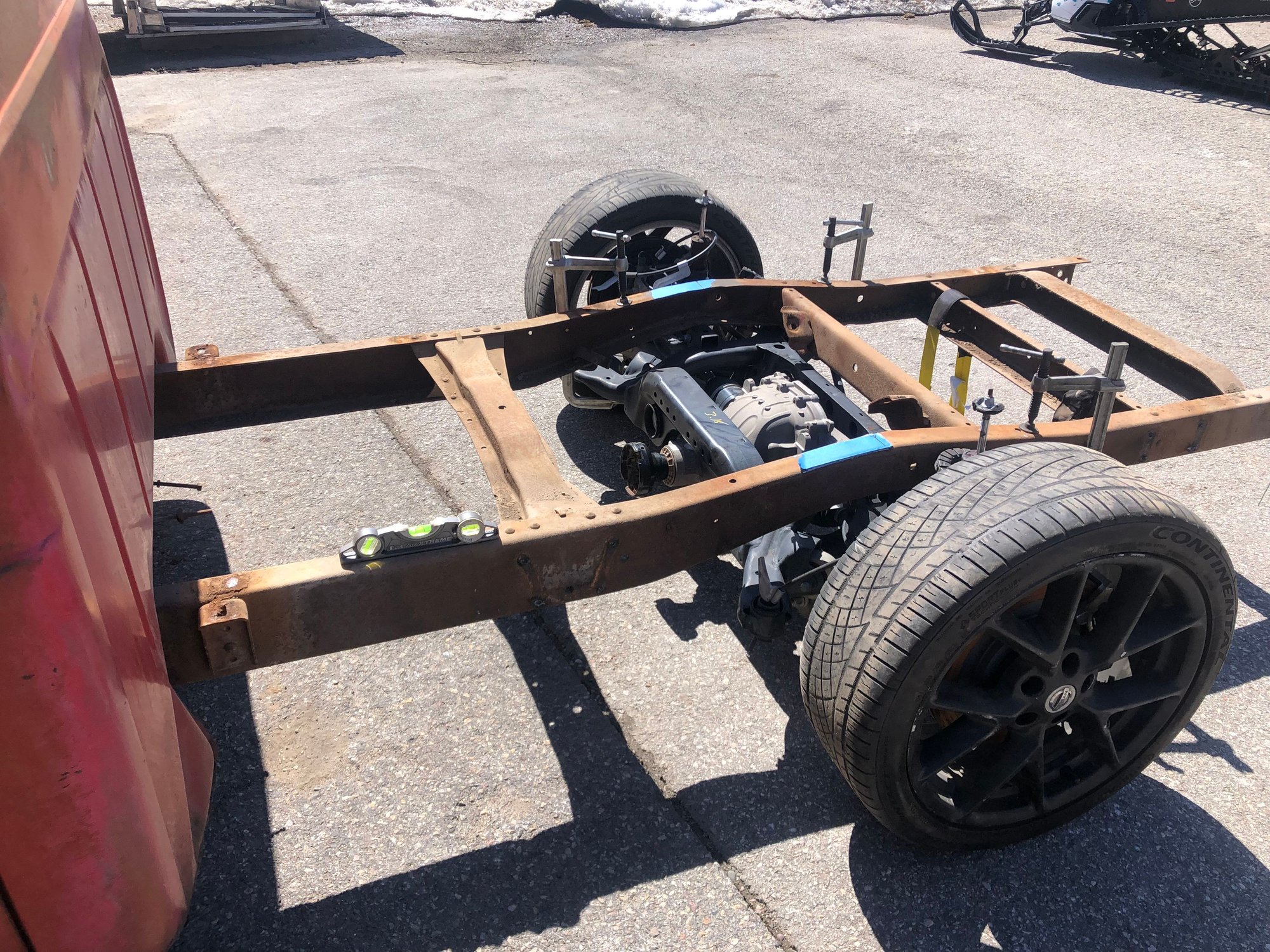 So here’s the rough placement of the CV front end. I found my center of the wheel well and marked the frame before removing the front clip. I’m open to all ideas and or criticism on this. The Mustang IRS pretty much slipped into place. Just sitting without any upper coil bucket, makes the drip rail over the door sit almost level. Everything is simply clamped in place, which means it’ll likely change some what. I do want the truck to sit basically level, I’m not fond of the stink bug look. So this where I made is to today. I like the stance and height. Everything is subject to change right now though, it’s just clamped in place.
