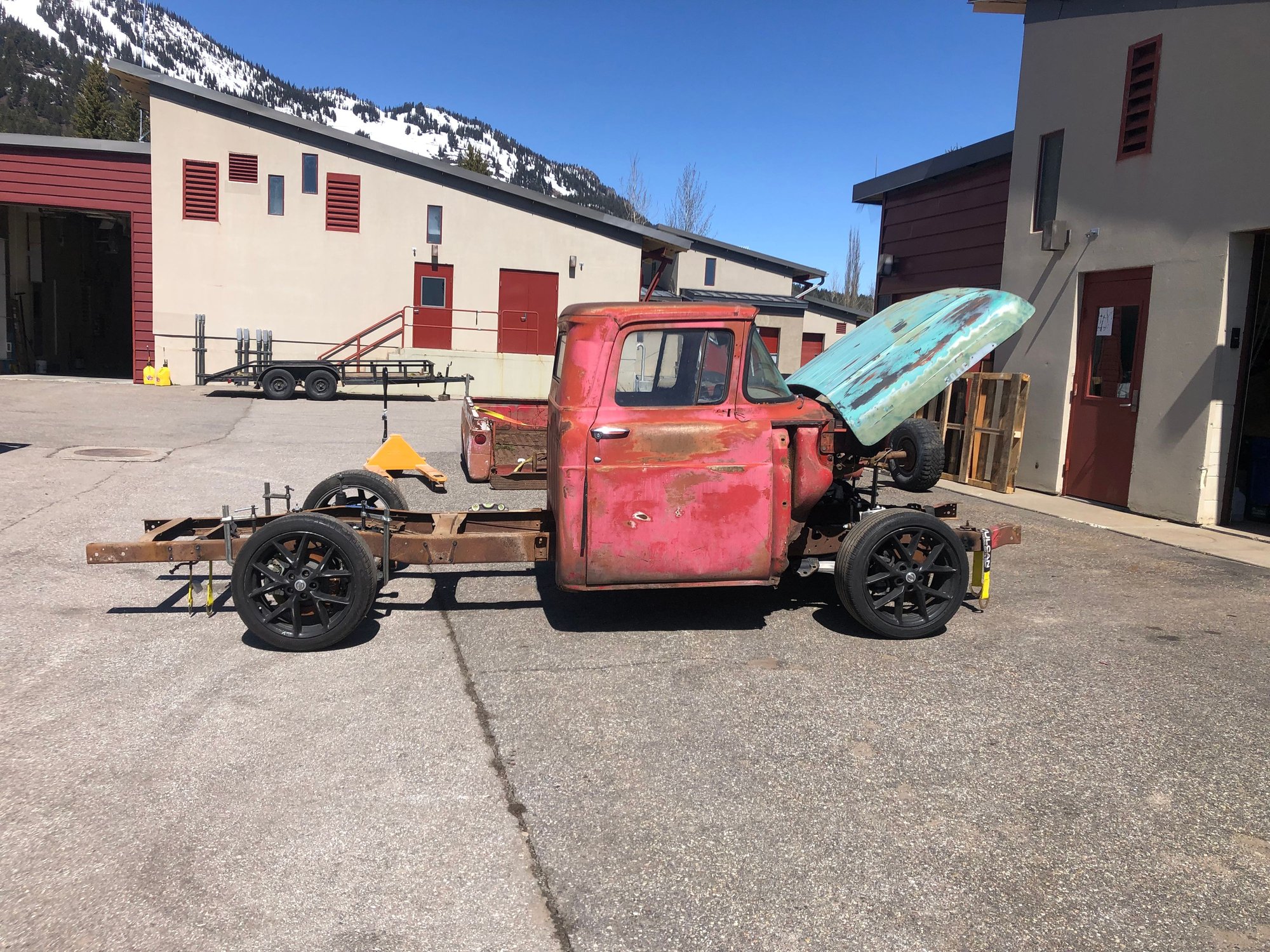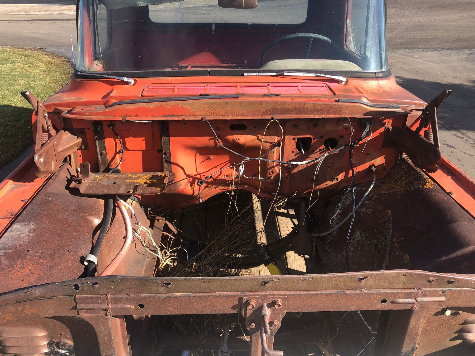 My plan is to put the bed and front end back on before I mod the frame. Then I can pull those and the cab off, at that point I’ll be able effectively clean the frame. After that I’ll be able to box the frame end to end.