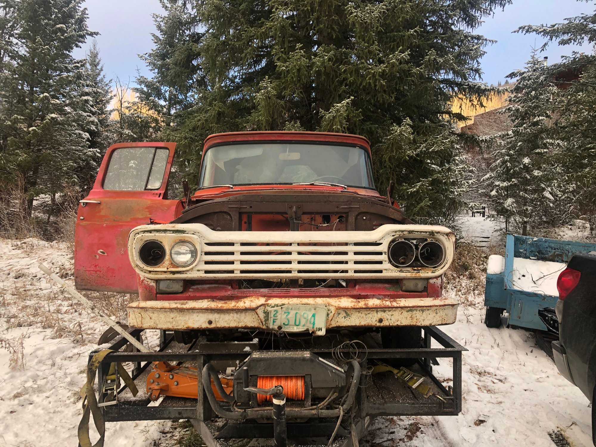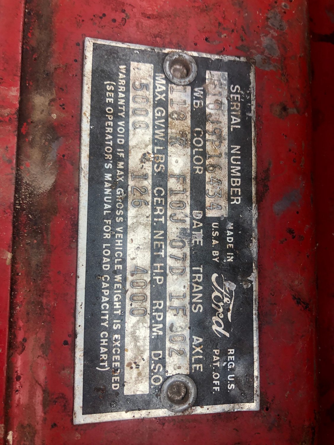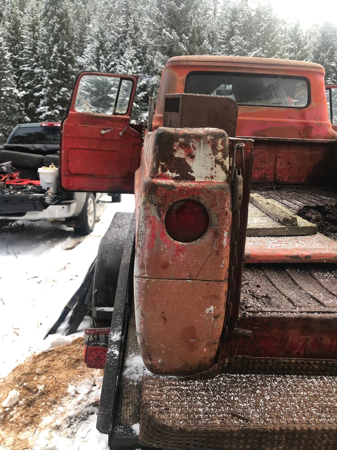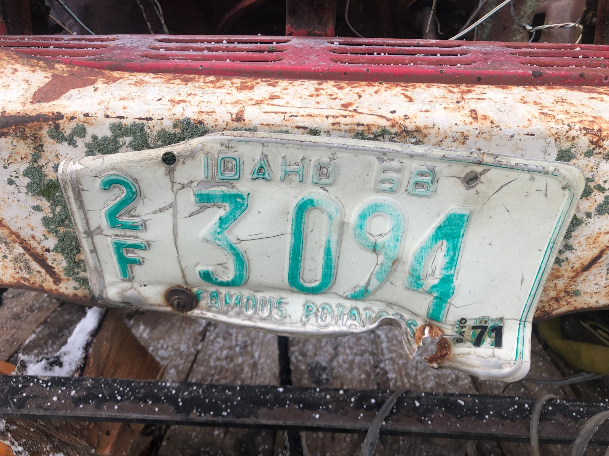 So I’ve been on the hunt for a father/son project. He wanted a long bed regular cab. I wanted cheap old iron. Well I found both: There she is in all her glory. Cab is in decent shape at first glance. Corners and steps are solid, but time will tell when I pull the mat and clean the interior. No hood on this one. The seller gave me a lead on a localish guy that has one. You probably also noticed that the engine is missing. This will be an undoing theme: hood, engine, transmission and rear axle were scavenged from this Idaho gem. I would of liked to have gotten the hood, but the rest I’m planning to have fun with… This is probably the best angle of the bed. The floor has a couple rust holes you could fall through. Of course the 2-3” of dirt in the bed probably acted as a sponge the last 40 years. The bed sides are kind of gorgeous, in a patina kind of way. Possibilities here include full bed replacement or just welding a donor floor in place of the old one. For the time being a sheet of plywood is probably easy/safest. On the upside I did get the tailgate with the sale. If the plate is honest, the truck has been off the road since ‘71. Makes for 12-13 years of service. Likely it was used on the farm for longer than that though. Either way, this was used hard and put away wet more than once.