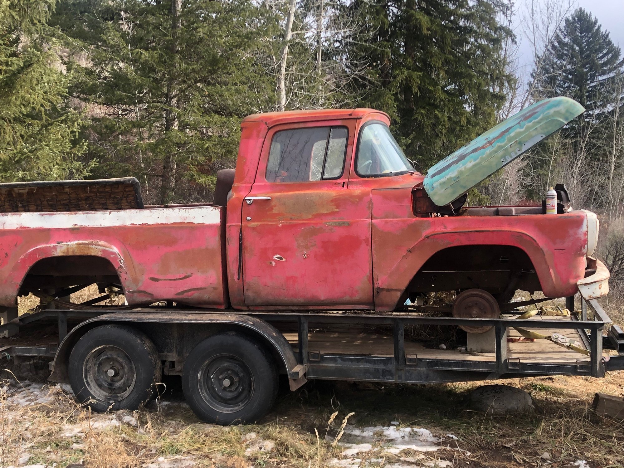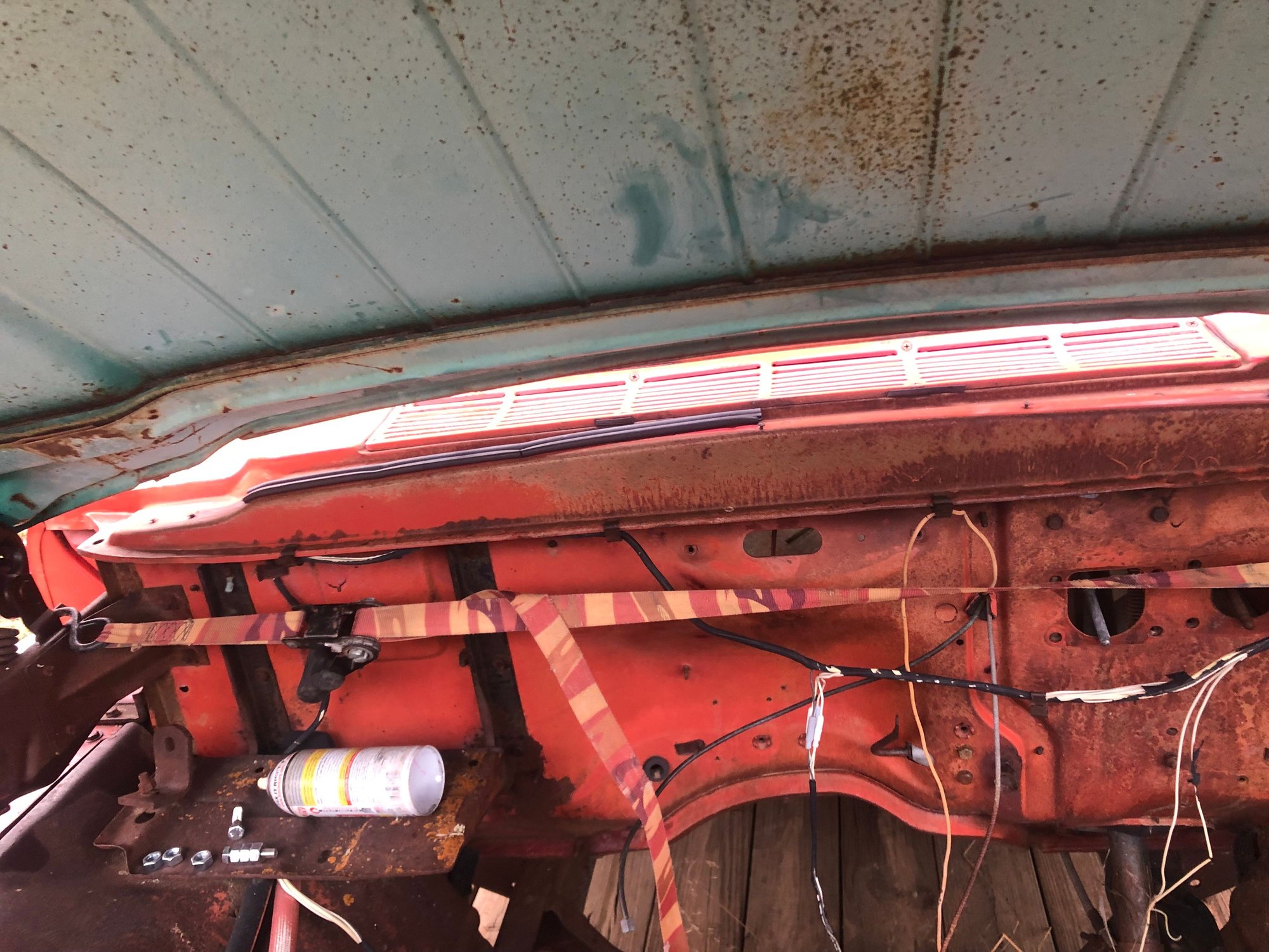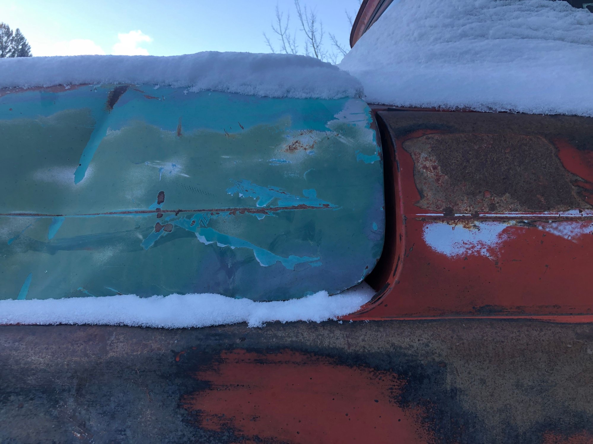 the seller had a red hood that likely would have matched the red of the truck. It would of been the same price, but it had one or two rust holes. I’d rather deal with dents and a color change then rust demons. There’s a ~6” crease in each side, but like I said it matches the rest of the truck. Rust is all superficial. I’m missing the latch catch and both emblems. Is there anything else I should be on the hunt for? So I’m no expert on these hoods. Seller claimed it was a 58-59 hood. I know the ‘60 had “mail” slots, but what are the other telltale sign of year? The reason I ask about the vintage is the holes didn’t want to align initially. With a little persuasion from a ratchet strap the holes lined up. Not a lot of movement was needed, maybe 1/4”. The wife helped me mount it, trying to wrestle it by myself was frustrating. Although this is where having the engine out was really helpful- I was able to stand in the engine bay. So this is how it looks. Hinges are not currently budging. I’ve given it a couple treatments of PB Blaster to aid it along, but no movement yet. I’ll keep soaking the pivot points and if that doesn’t work, I’ll move on to heat. I’m not sure the daytime temps are helping, but I’m guessing it has more to do with sitting in a field for 30-40 years. On the bright side at least they’re stuck up, not down. I’m sure that’d be a real PITA to work with.