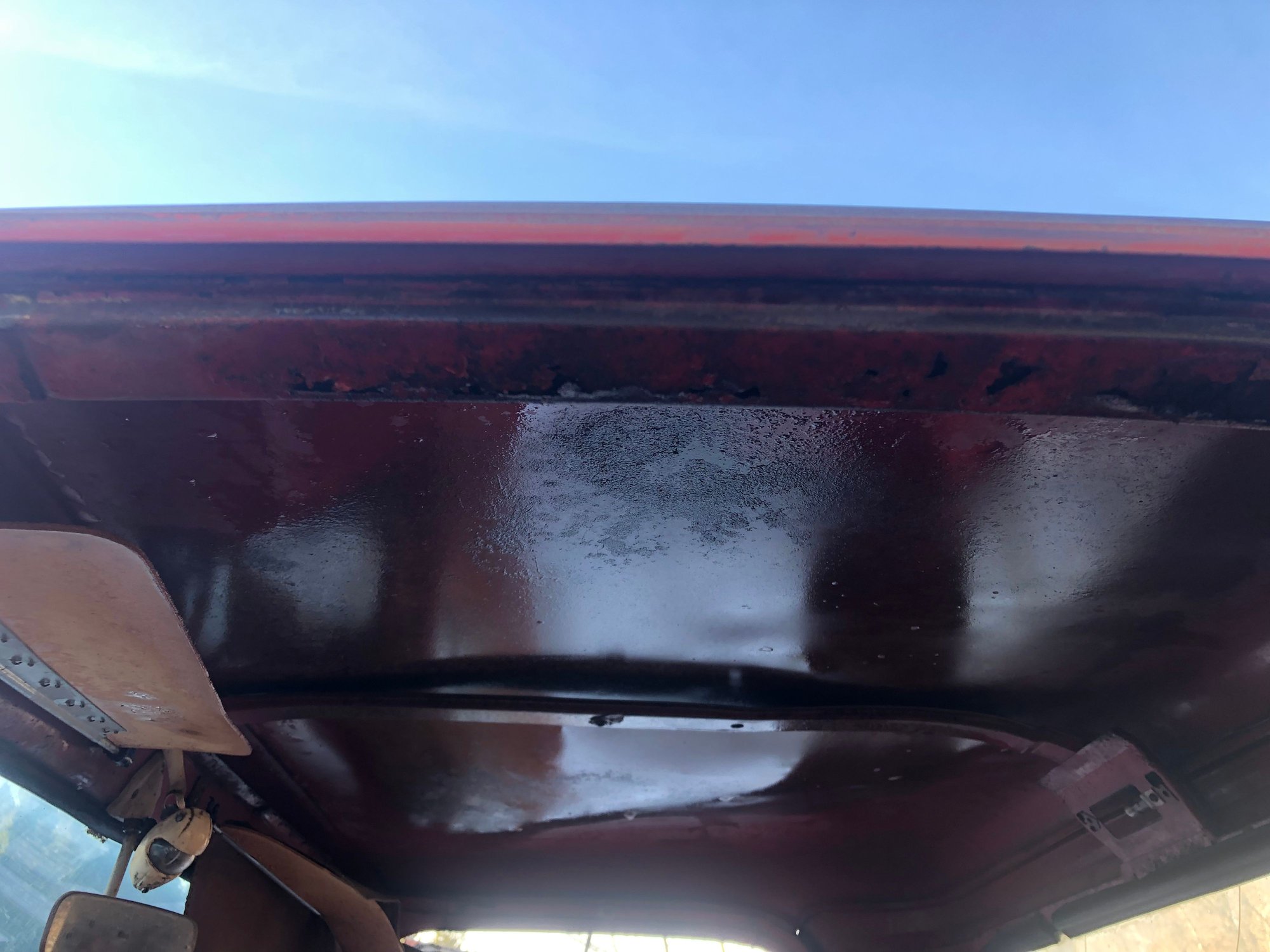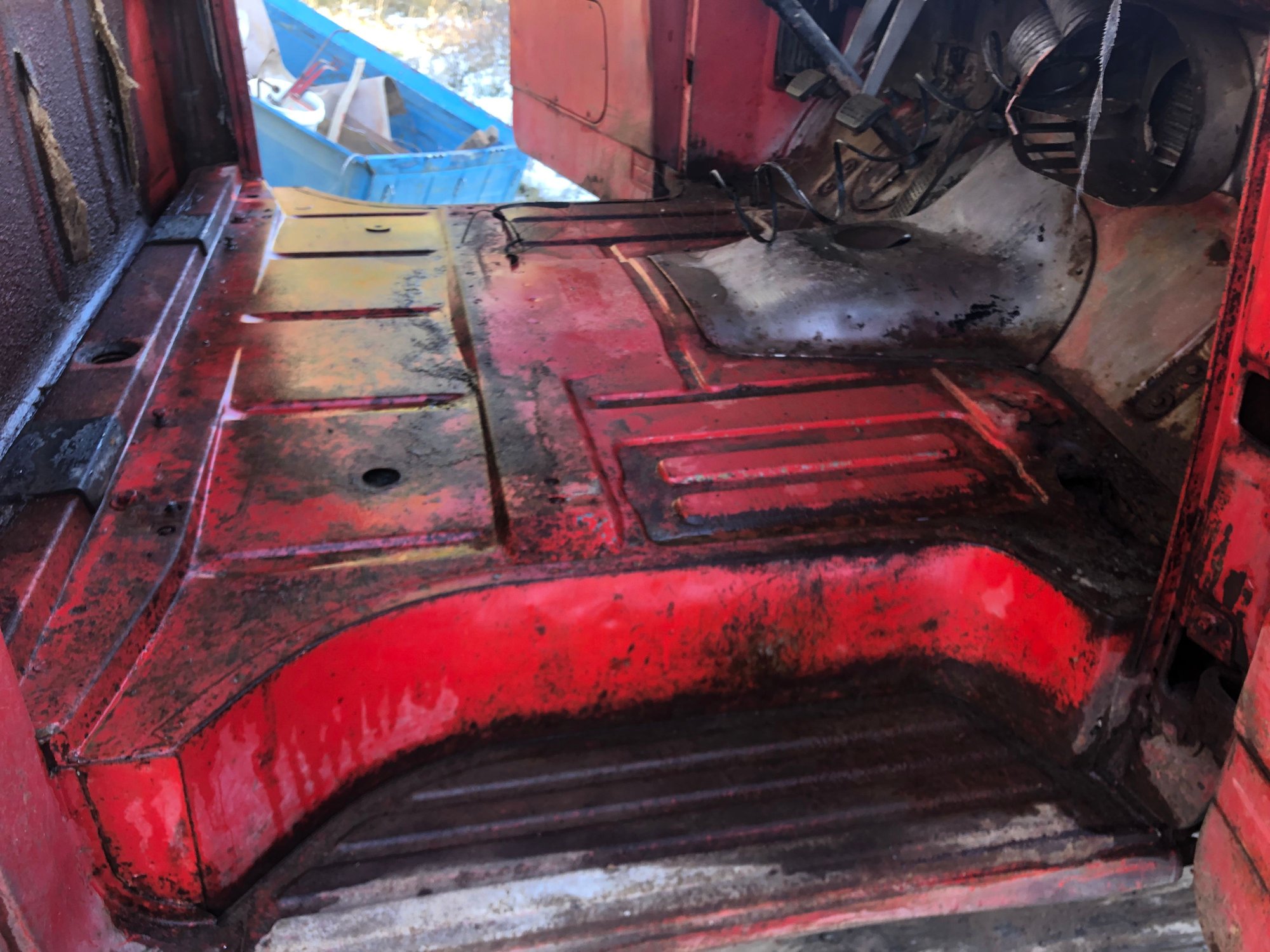 So it was a chilly, but sunny day. Better get the interior cleaned out. Two bags of mouse stuff, not to mention the 10-15 pounds of dirt. So what did I find? Mostly as I thought it would be and one thing I should of seen on the initial inspection. First the floor: All in all, not really to bad. I think that the glass being intact save the cab from a worse fate. Cab corners are pretty solid front rear. The steps have a little bit of rust on the leading edge of the passenger side step, but it should be manageable. This side was good in terms of decay. Dash is solid and half the ***** are intact. This is one area I really want the original look. I’ll probably not use the original seat, but when I look at the dash I want to see original stuff on the dash. I may have to compromise some one the gauges though. I think I’ve found most of the cluster, but it’s in so many pieces…. I couldn’t see the floor above the cab mounts due to the dirt and mouse bedding, but I could feel that they were gone. Getting the mat out, sweeping the loose debris and pressure washing showed the area to be about as one might expect. The mat is in serviceable condition- kinda brittle, but I was able to remove it in one piece. The headliner was beyond droopy, but I saved it as a template for a later day. Gas tank and back of cab were shockingly good. Nothing but smiles. Didn’t even break any bolts pulling the tank. Speaking of which, how much does this tank hold? Here was an area I should of seen, but honestly I didn’t think to look. The header on the drivers roof is paper thin. On either side of this piece it good, so hopefully I’ll be able find a patch panel. Sun visors have lost their covering, but they look pretty simple in design.