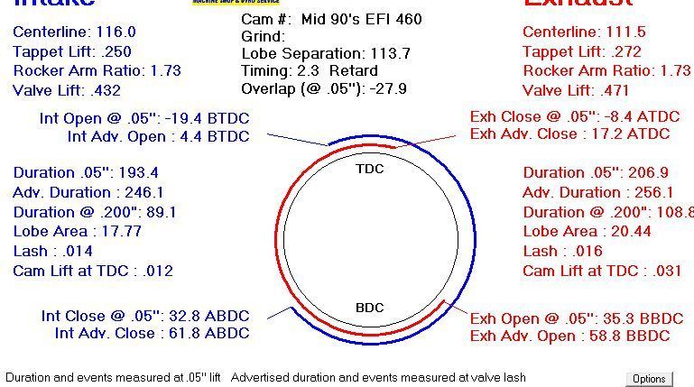 I looked through my library of cams that I've plotted and I've got 3 cams on file. All of them are slightly different with very similar durations and lobe seps but differing amounts of lift. All are ground with a lobe sep that's between 112.5 and 113.5 so I'd say that 113 is the spec. As far as the duration is concerned they all have an intake duration that's in the lower 190's, about 193 degrees @ .050 with a valve lift of about .420. This is probably pretty good for the application, it's certainly not out to lunch on the intake duration. The exhaust side has between 204 and 208 degrees at .050 duration with the carbureted 460 cam being the smallest at 204 and one of the EFI cams being the largest at 208 @ .050.