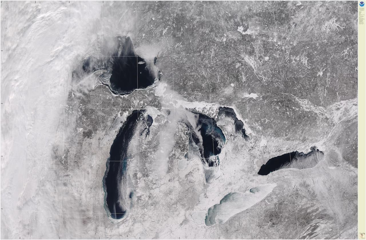Looking like the Great Lakes have quite a bit of ice. Forecast has a warm spell coming up, but Superior is close to 50% ice covered, and Huron at 72%.
