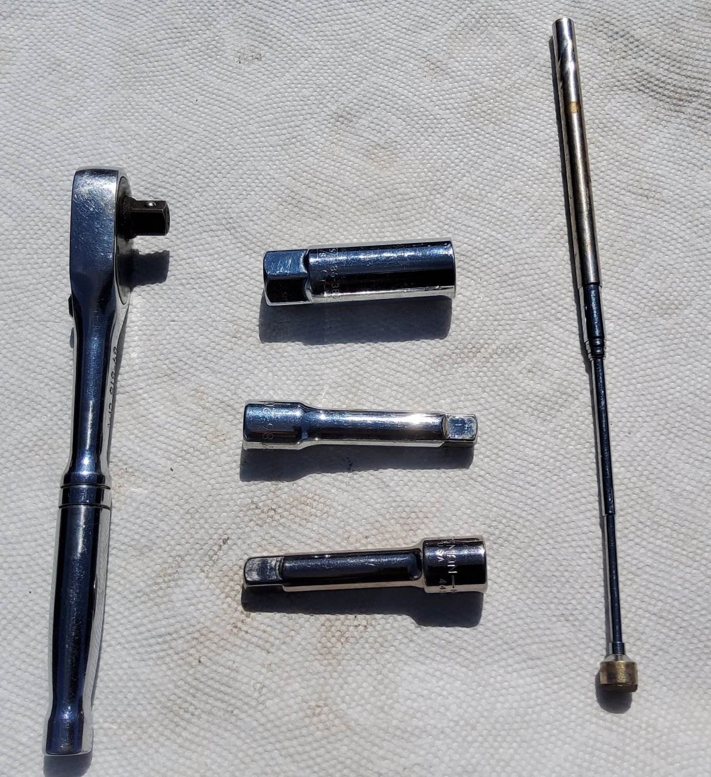 These are the only tools used. 3/8 ratchet, 2 3" extensions, 5/8 sparkplug socket, extendable magnet.