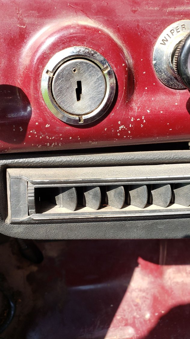 See below. Does this mean the ignition switch is upside down? So, poking a paper clip in there will release the mechanism to ... slide out the back as a unit?