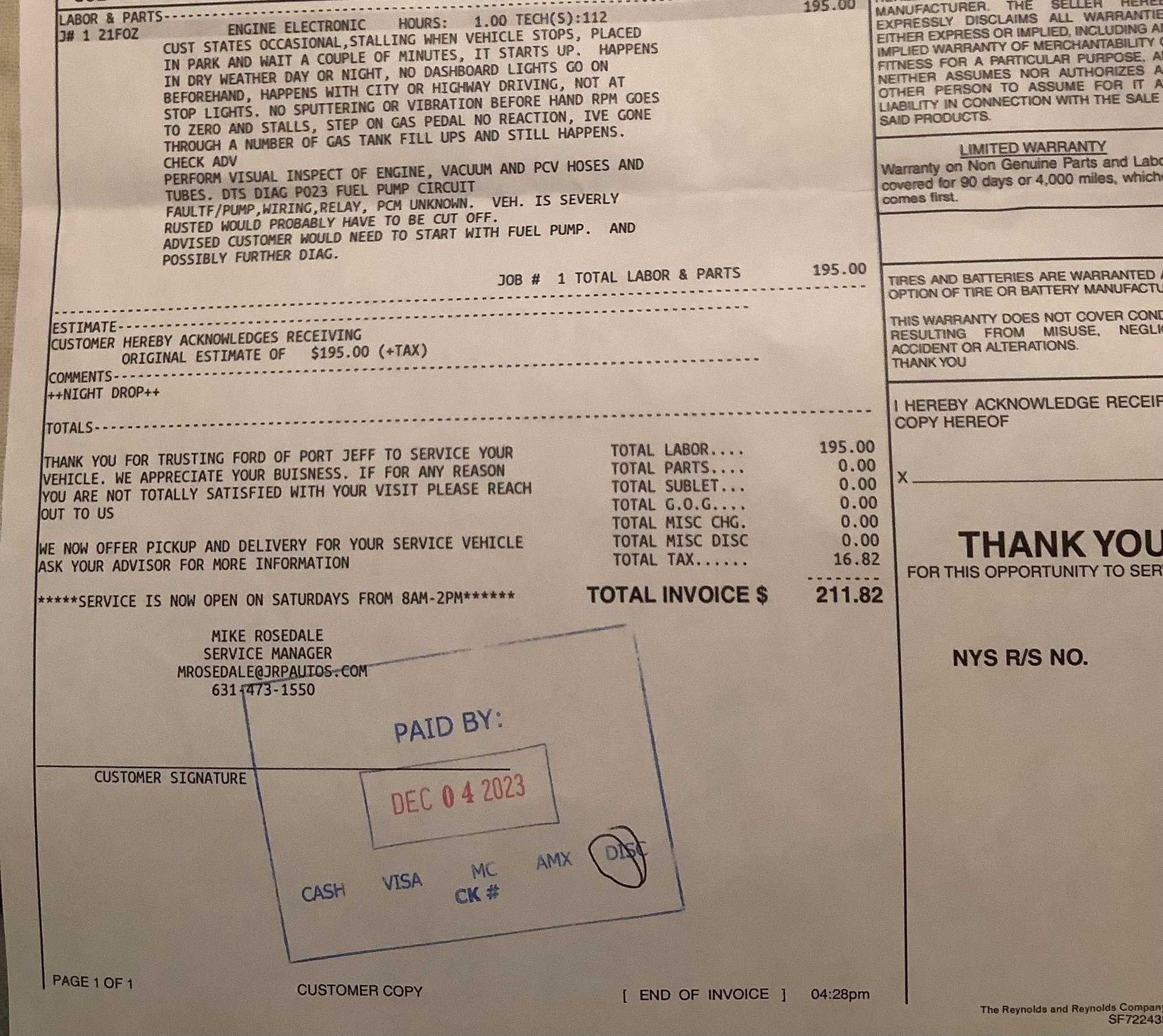The service advisor said the only code given was P0231. The receipt says P023. There had been a 1000 code from earlier that had been removed. He “suggested” we might replace the fuel pump and sender unit, but it might not do any good and cost $2898. I don’t want to spend $3000 for something that might do nothing. A less expensive experiment would be to replace the relay, which also might do nothing. This is the invoice