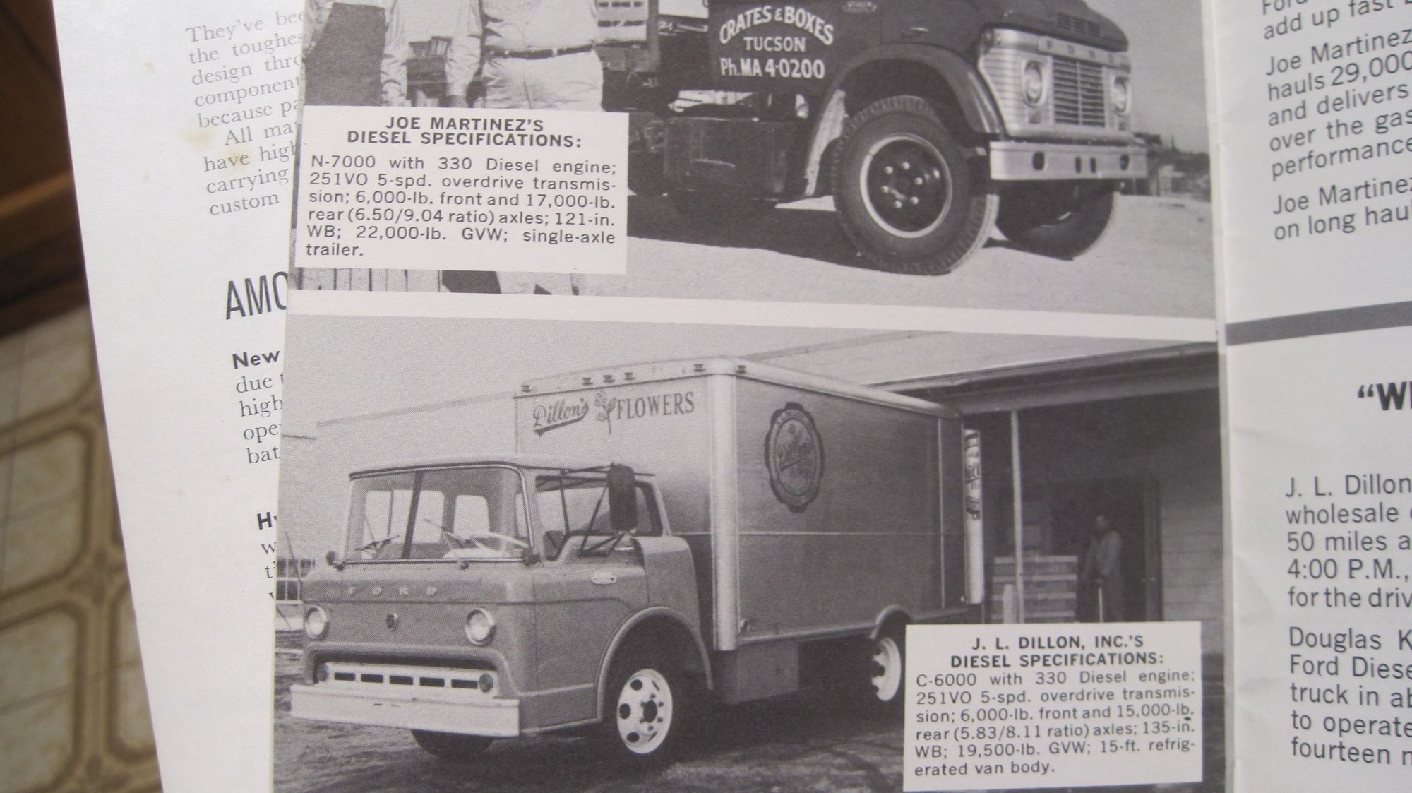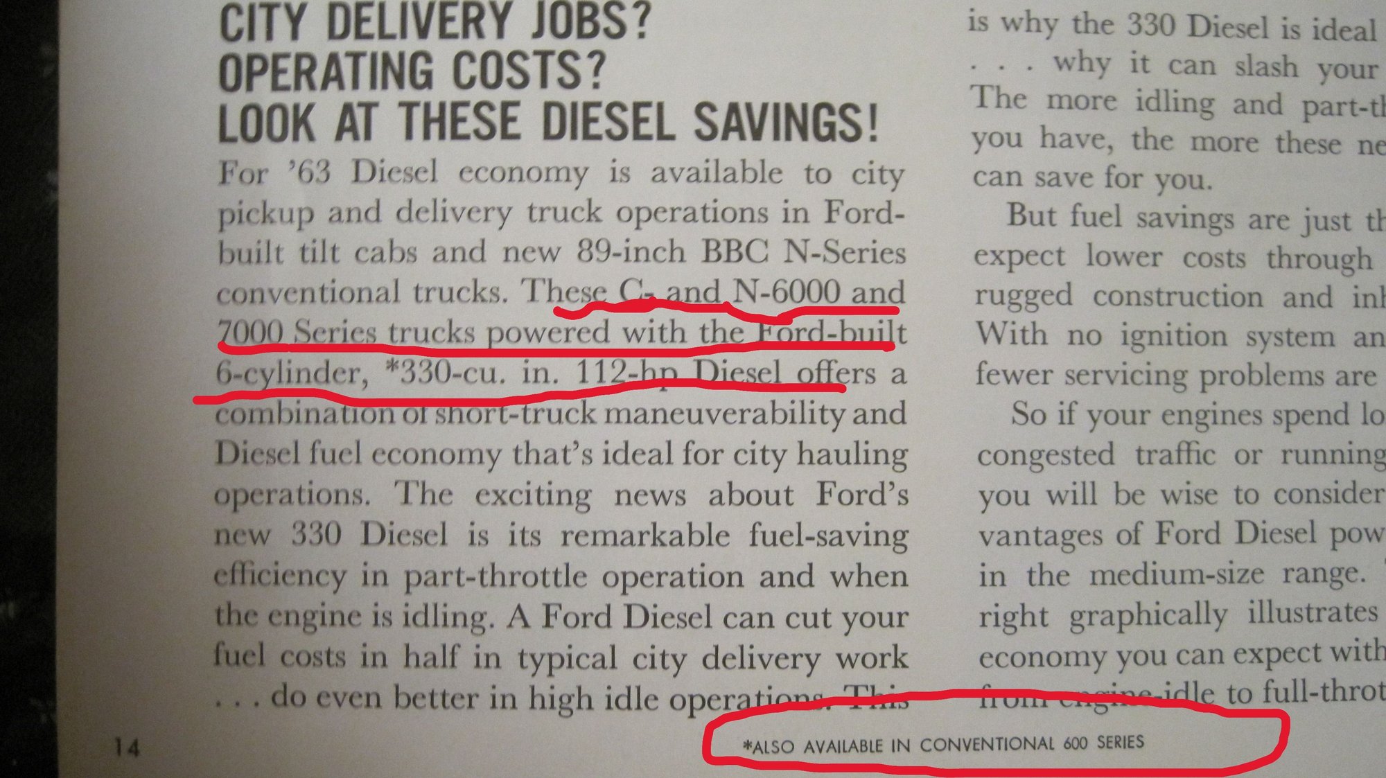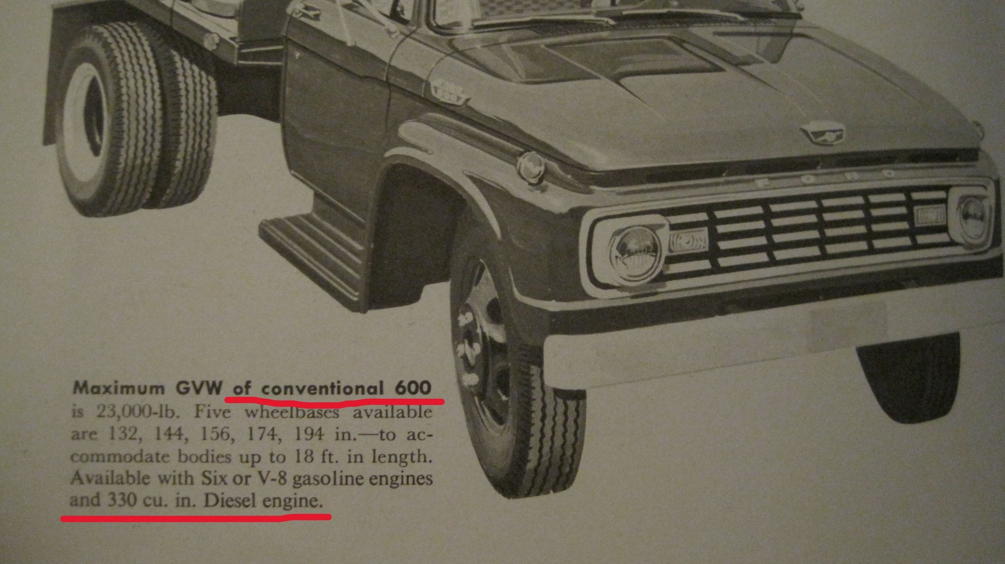 In '63 Ford used the 112 hp Dagenham 330 diesel for the C and N series. Designed for city pickup and delivery work, not raw horsepower on the highways with full loads. They were DSO, special order on F 600's in the Canadian market only. Diesels run at slower speeds, so a numerically high axle ratio and or an overdrive transmission was a must. In '68 Ford started offering the more powerful CAT V8 diesels in American built F 600's.