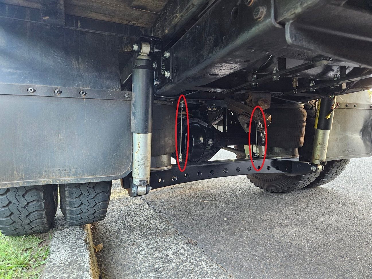 Yes, as FordTruckNoob pointed out, it has 2 Hendrickson auto levelers, on for each side as she would lean due to the tools and fuel tank being on one side.
