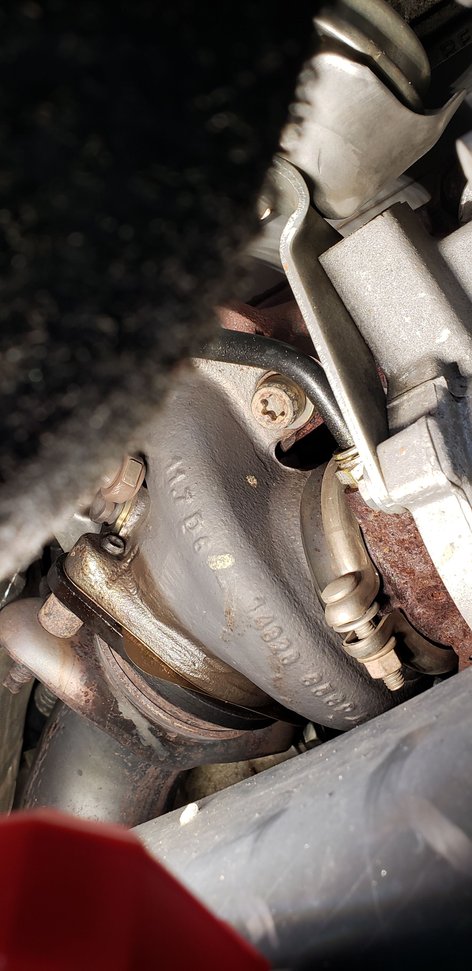 Back around Christmas, we were warming up the truck to drive to see family when I stayed smelling the faintest oil burning smell. I drove it 5mi to try to diagnose, smelled it strongly when I stopped and parked the truck until now. Went out today to diagnose it and there is smoke coming from the rear seal of the turbo, as well as what could be best described as boiling water. Mind, it has rained buckets over the last week, so it could be a little of that (I'm sure it isn't). However, there's oil on a line on the wheel well side of the turbo as well as oil drips on the exhaust end on the inside of the turbo. I am assuming it is fatal to the turbo, but I'd love confirmation from the group. The black line plugging i to the top is thw one with oil on the outside. The gasket to the exhaust is where the boiling was coming from.