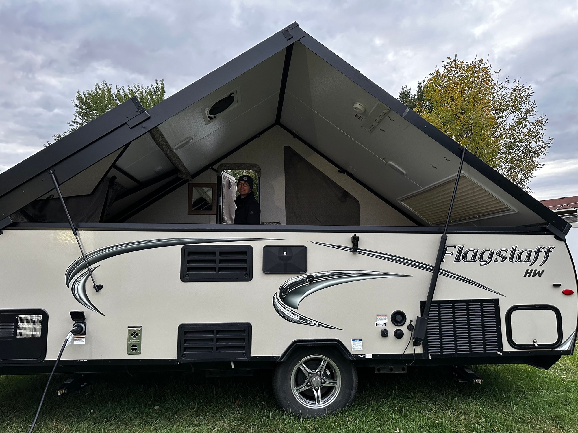I settled on an A-frame camper because it's almost as aerodynamic as a conventional popup camper, but only takes a couple of minutes to fold up. The old popup took almost an hour, and all of the tugging and pulling was difficult with my hand problems. I believe Aliner pioneered the design a couple of decades ago, but Forest River has been making them for at least ten years. This one is a 2019 with a cassette toilet, heat pump, hot water, and electric brakes on a torsion axle. It's perfect for us!