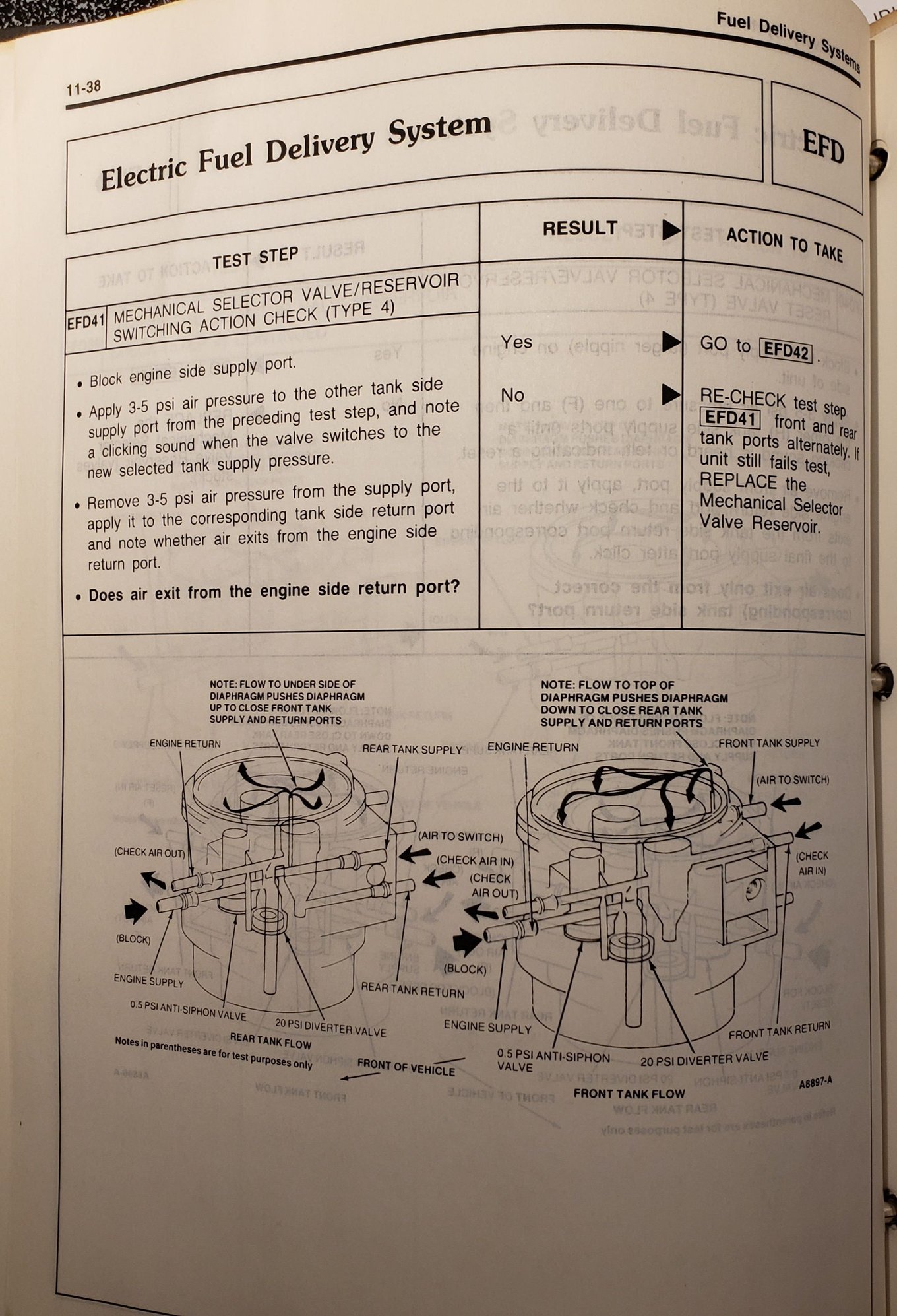 I see now your referring to a manual of sorts, I think I have similar manual. Mine is the Master Parts Catalog for 1990 light trucks. Since the Bronco in question is an '89 does your PCED have a pic/diagram of the accumulator? Broncos only have one tank so it isn't the same as this selector valve but, if I'm right it is in the same location in the fuel system.