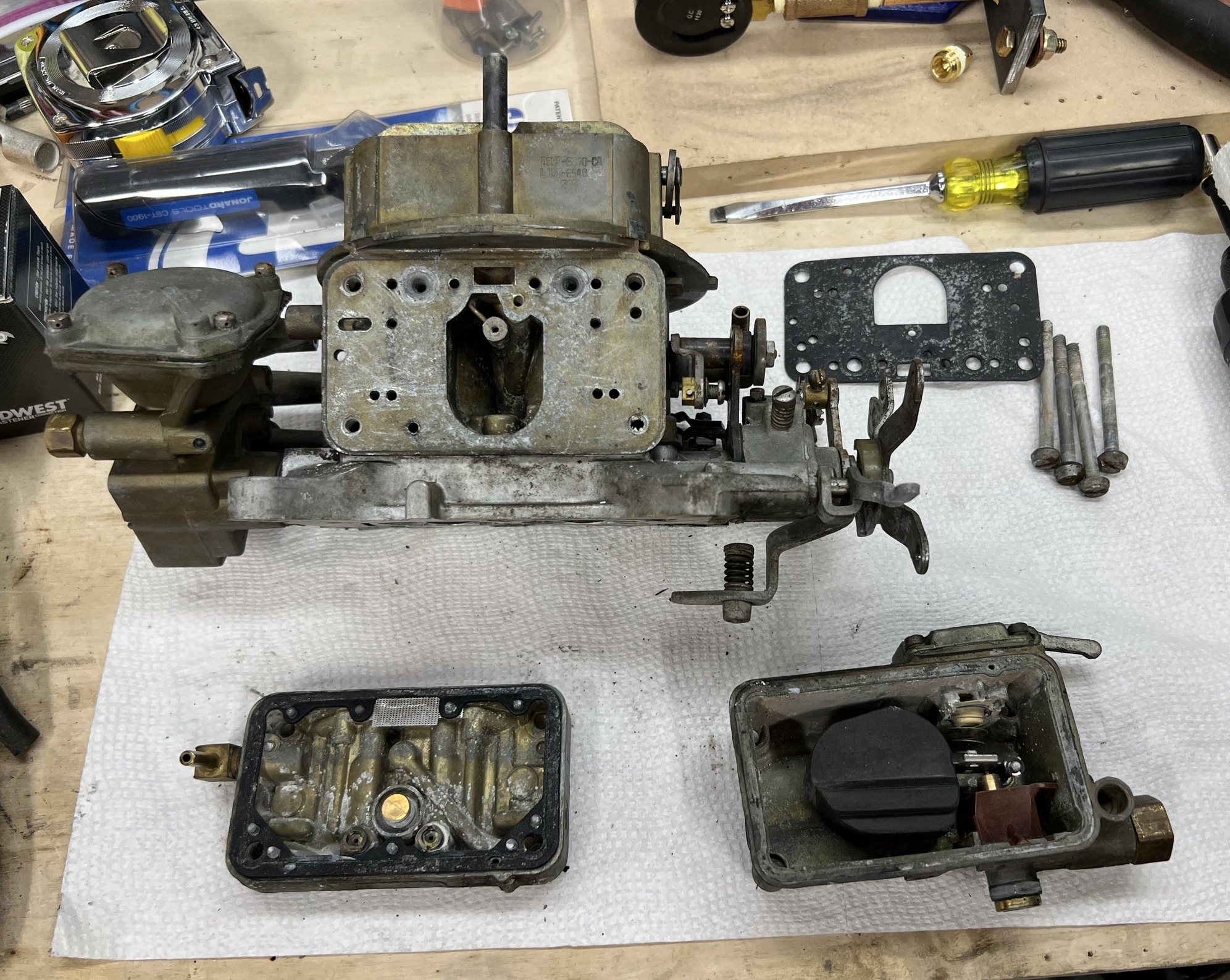 I can't really give you any Holley tips, as this is the first I've touched in perhaps 30 years, and I wasn't a Holley guru back then, either. Generically, every orifice should be chased. Mine is relatively clean, and I'm content with spraying the aerosol and watching the fountain out the other end, kinda like half-assed injector spray pattern testing. Make certain your gaskets fit and that you don't leave any out (my vacuum governor was missing a o-ring or gasket between it and the main body, for example).