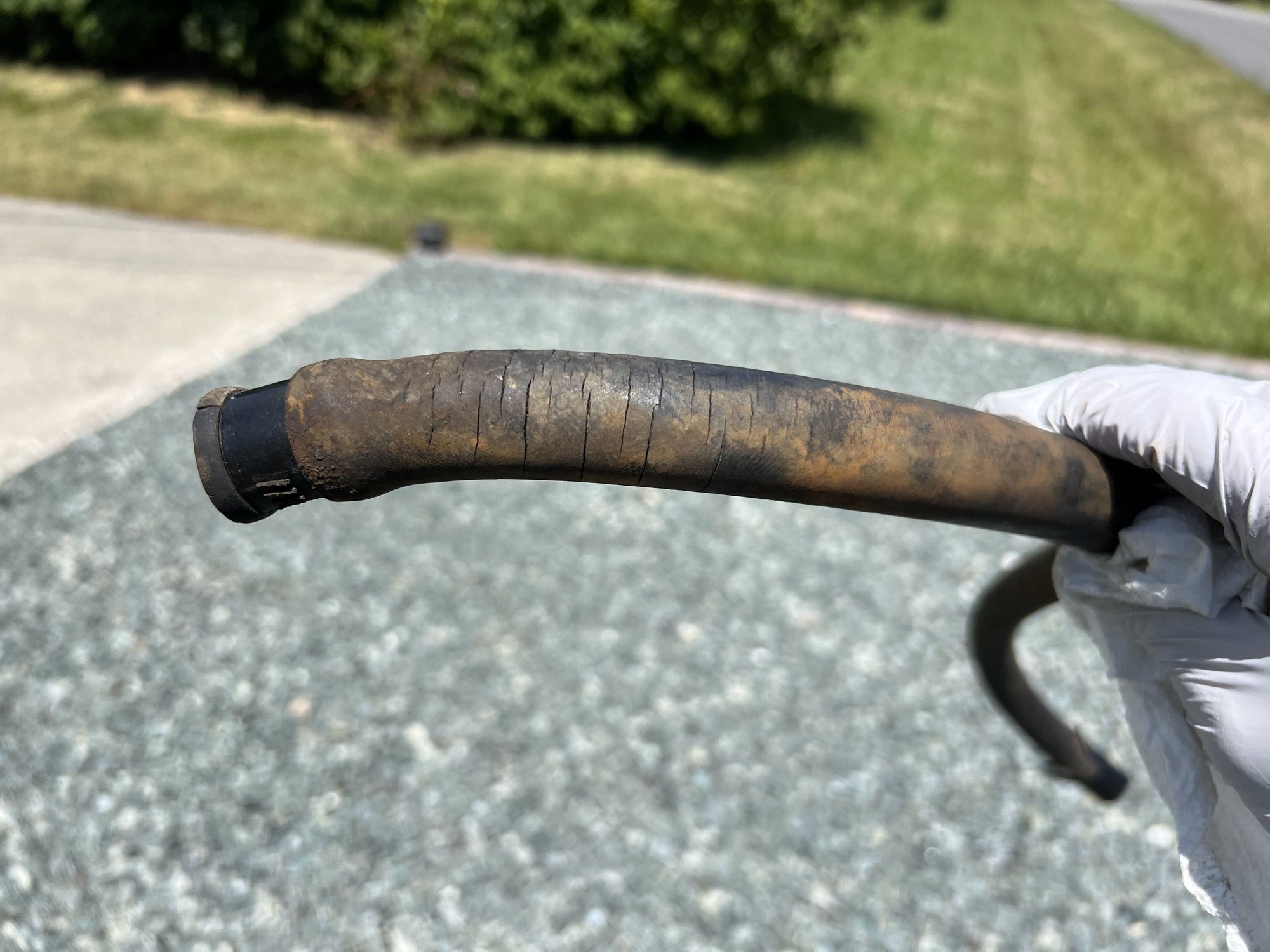 You might think that's just cosmetic, but let me assure you that those cracks leak to the vacuum side, and because there are so many and so diffused . . . no noise. I had a devil of a time finding that one. It's about 30" on mine, probably a bit shorter on yours.