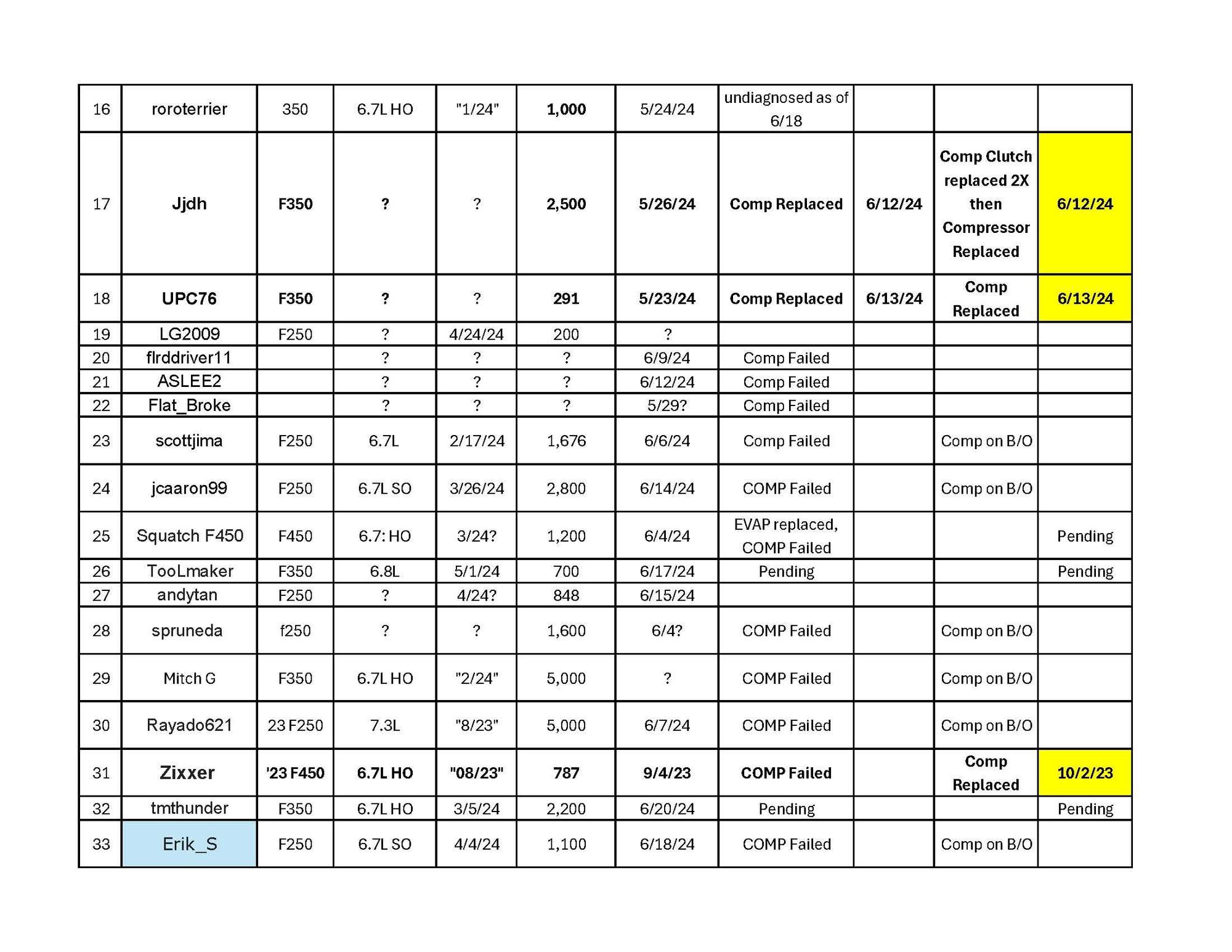 Just to give you a heads up my 2024 F250 died at roughly around 930 MI for the air condition, it's been sitting here since with no parts available and 103° heat index weather. It was at the dealership on June 3 when they found the system had failed and sent metal shavings through the system. So it's been sitting in my driveway since June 3rd I use my backup vehicle to go back and forth to work I'm trying to see if they'll give me a loaner now and cuz they said no end in sight. I contacted customer service as well even on the 18th of June, and no Parts yet inside I too am waiting for thermal expansion valve and the low suction hose, also the compressor they gave me is basically like the one they pulled out so is that going to fail in another Thousand Miles I don't know. Right now I'm trying to figure out another mode of transportation and I just caught up to dealership today and they're going to try to get me into a rental vehicle probably next week. The dealership has been very helpful for me and they've been working really good but they can't get parts and it's not the dealerships fault they have done a lot for me. The truck was ordered through the dealership and sent directly from Kentucky to the dealership when I took possession of it. It sat on the lot in Kentucky after production for 30 days to undergo quality inspections only to last a very short time. So much for the quality inspections, even when I first got the vehicle I was complaining about sounded like a bearing was going bad on something which I was wondering if it was a compressor ironically the compressor was shot. I hope that the compressor they give me is not going to be the same quality as the last one and I'll be back in the dealership for the second one down the road. Ford really needs to address this problem as quickly as possible but you know how that goes. They've already started running customers away from where I work at. And we use a lot of Ford trucks at work. Oh well what can you do, I wish everybody gets here is fixed quickly as well as myself good luck everybody. I might guess I'm in for the Long Haul.