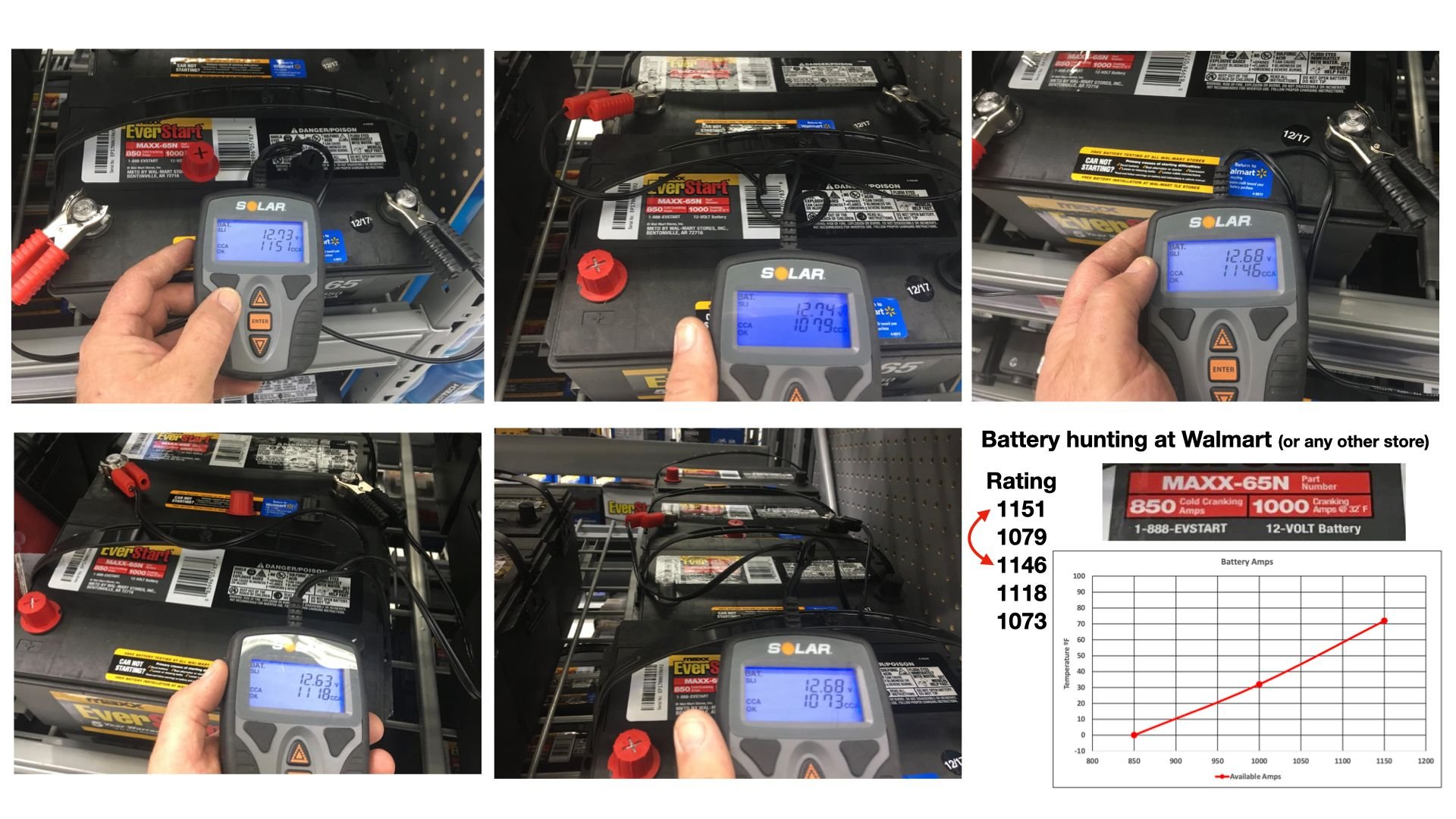 Yours (Walmart) are definitely different from what I see here in Jersey. The 65 batteries are always manufactured in the same month, and you've seen that I always test over 1000. I've never checked the other group sizes, but I have seen those with production dates a few months out. I've never tested those. We often have a situation where I've seen the group 65s out of stock. I had to get one for the Lincoln LS last year when the kids vandalized the farm, and I had to go to three stores to find a group 65.