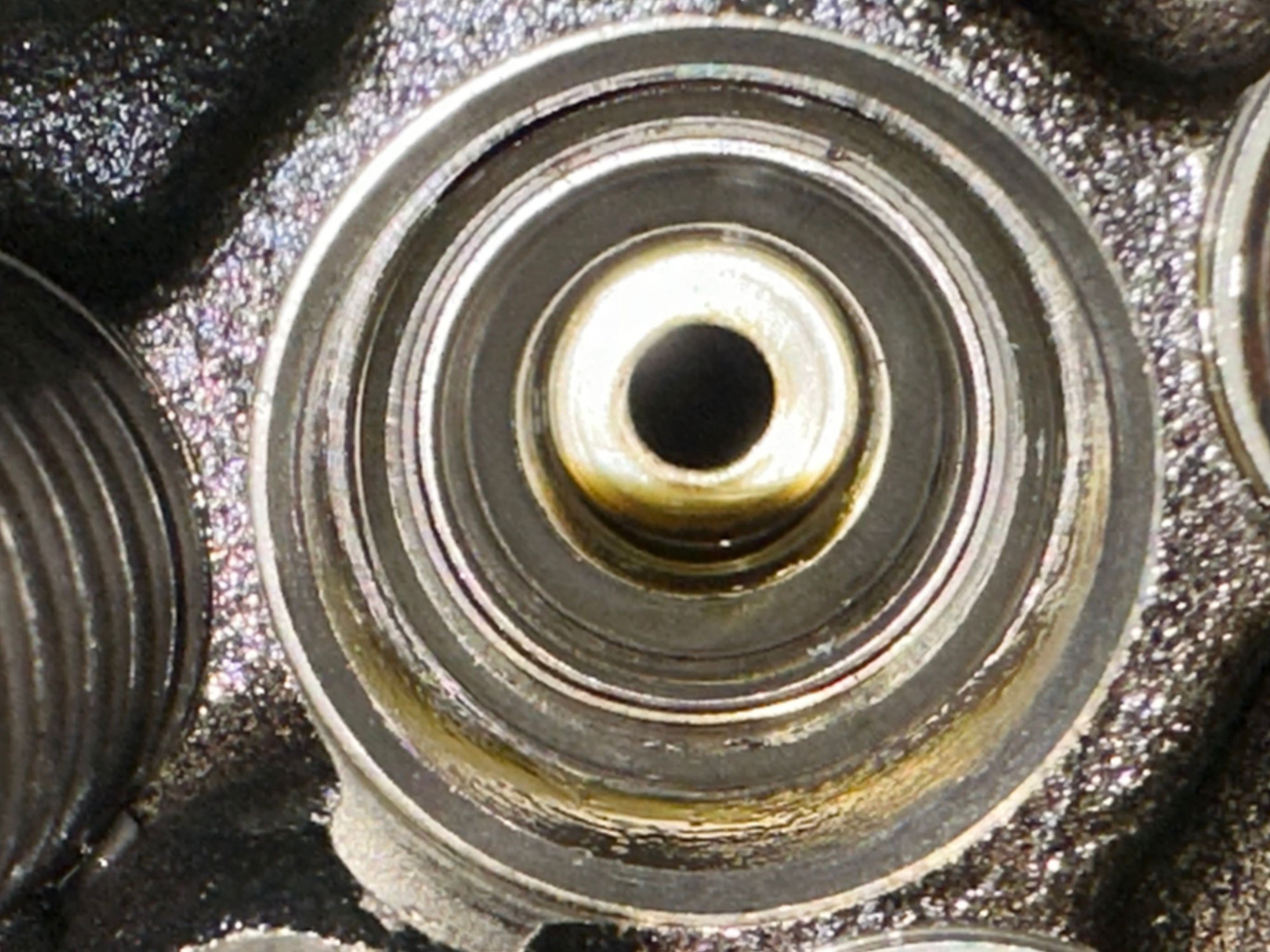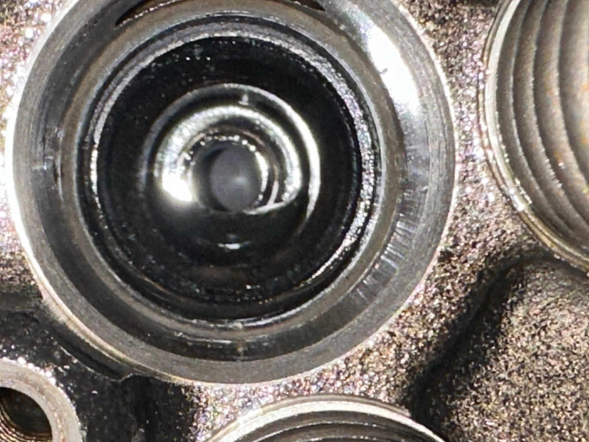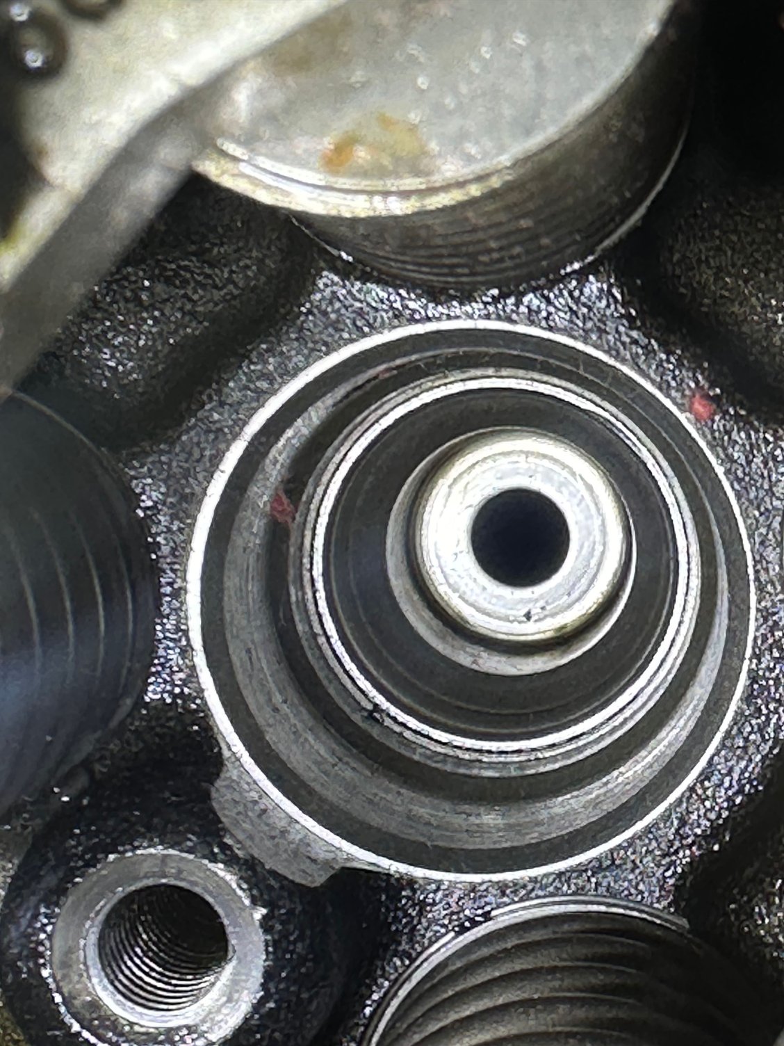 The first sealing surface appears to be damaged at one point (red circle). The second sealing surface is unusable. Both are caused by improper injector assembly.