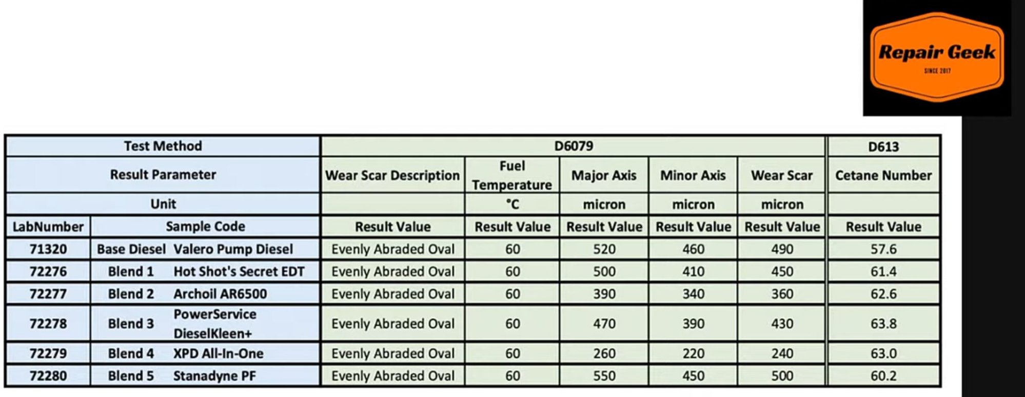 As far as I am concerned, his wear test is meaningless. It is well-intentioned, but meaningless for the CP4 application. HFRR (High Frequency Reciprocating Rig) is the defined method for testing this application and his test rig has absolutely nothing in common with a HFRR test, other than friction.