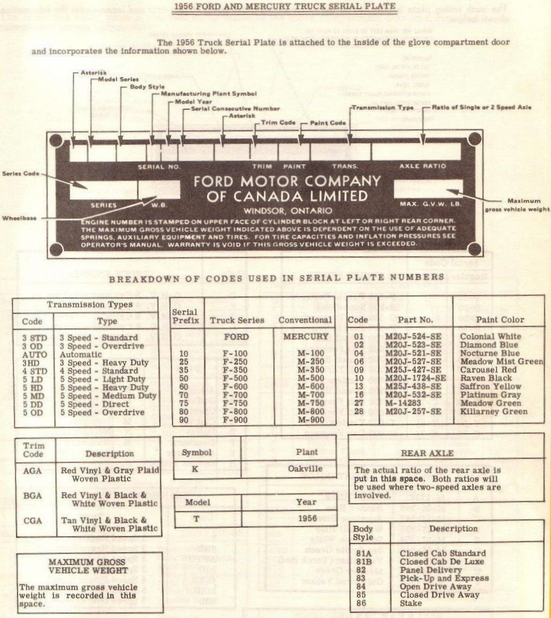 Canadian decode documentation seems to be somewhat sketchy. Codes were changed regularly and the '53 code page won't help much for a '56. And even this seems to have some shortcomings. It's a bit more helpful, but most of what the plate says is self explanatory. Codes changed again for late '56- '57 so a 57 chart would have more accurate decode data for the serial prefix. I'm not sure how the 131 part figures, but the 70 is 700 series and the 75 is 175" wheelbase. Plant, year, trim and color are all listed here.