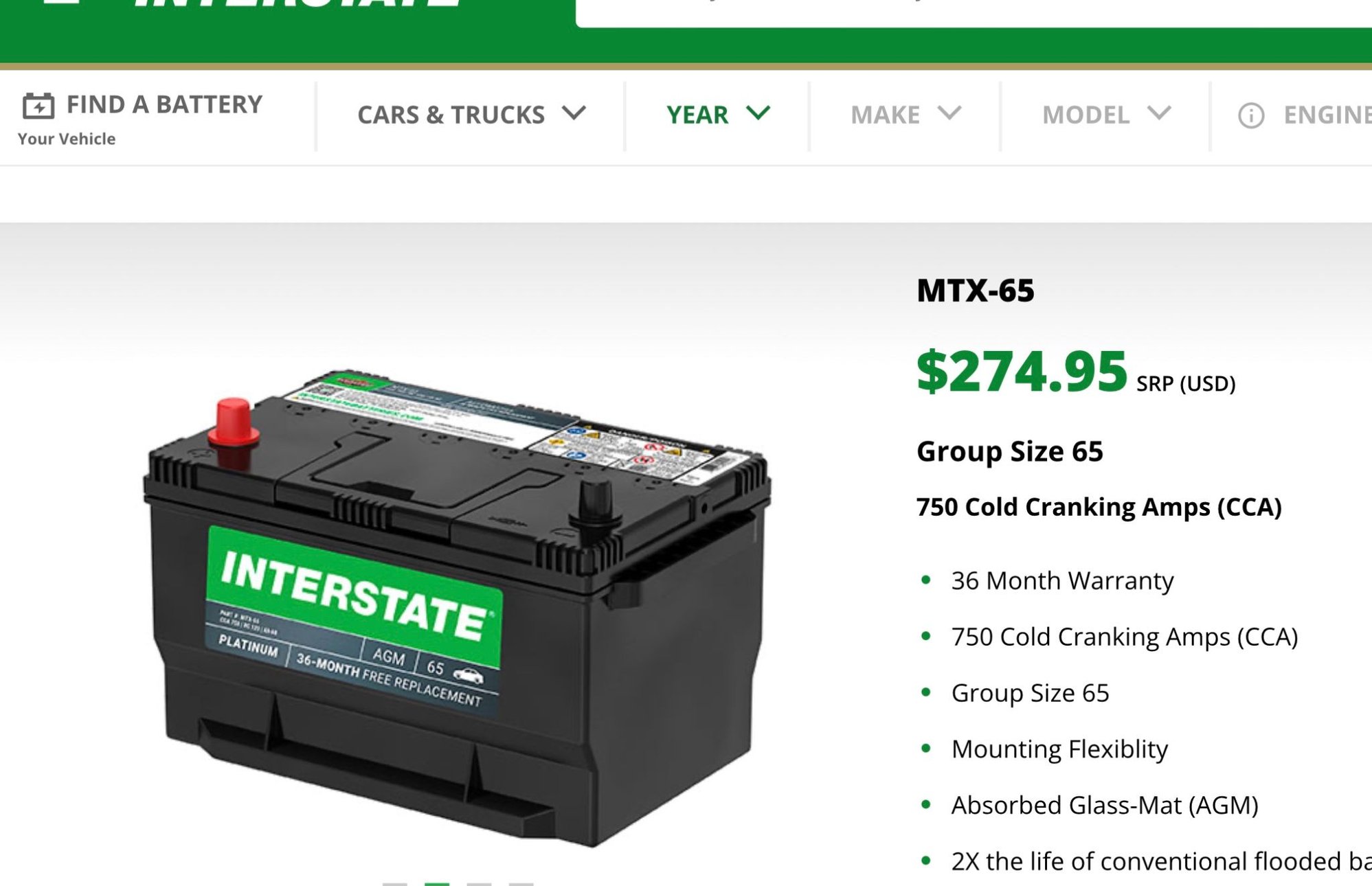 As I just today purchased 2 Walmart EverStart Platinum AGM batteries, Group size 65 with 775 CCA. It has the fold down handle in the top of the battery.