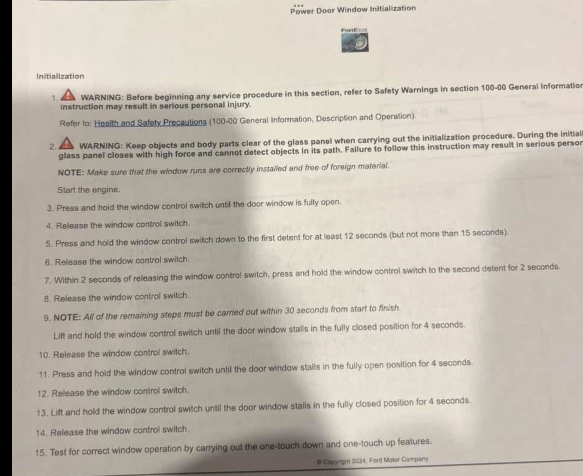 I can confirm the above instructions work. It is very specific and tricky, took a couple of times but worked. The first 2 things are what opens up the re-learning of the window. When you do it you window will immediately open all the way down. In my case the window would open and you still had a sliver of window visible. As you release the button from the initial set up it immediately dropped an inch or so. Then you have to run through the last items quickly, which are basically the generic instructions you see posted on YouTube/online but didn’t work for me. The key was the initial 2 steps..holding it down on first detent for 12 seconds, then holding down on the second detent for 2 seconds, that’s when my window dropped fully. I used a stop watch.