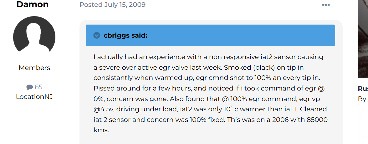 I pulled and cleaned the EBP sensor and tube with MAF cleaner. Mild amount of carbon build up in the sensor and tube, certainly not blocked. The IAT2 sensor was a different story and was completely plugged. I was hoping this was going to resolve the problem as it correlated directly with this post IAT Sensor? - Page 2 - 6.0L Power Stroke® Diesel Engines - Diesel Technician Society, but the problem remains. Any ideas on how much rise will occur on IAT2 when the EGR is open? IAT was around 86F and IAT2 would rise to 130F. Seems it should be much higher than that.