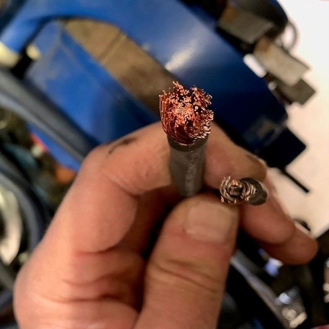 Starter cable: 45 years old and too close to headers. Bad combo!