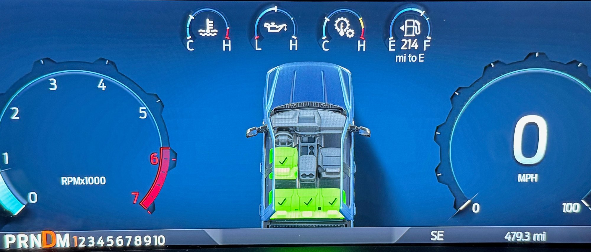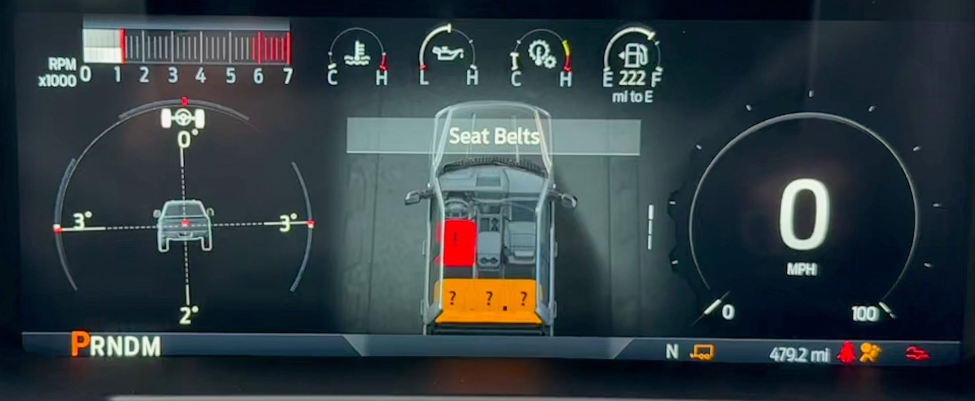This is all expected behavior. However what is driving me crazy is that now, the green checkmark seatbelt status screen shows up AND NEVER GOES AWAY. Even as I am driving around town, there it stays, smack dab in the middle of my console, telling me that why yes, you and your three phantom passengers all have their seatbelts on correctly! I have to explicitly go in and select, for example, "Offroad -> Compass" or some other info screen, to get this screen to go away.